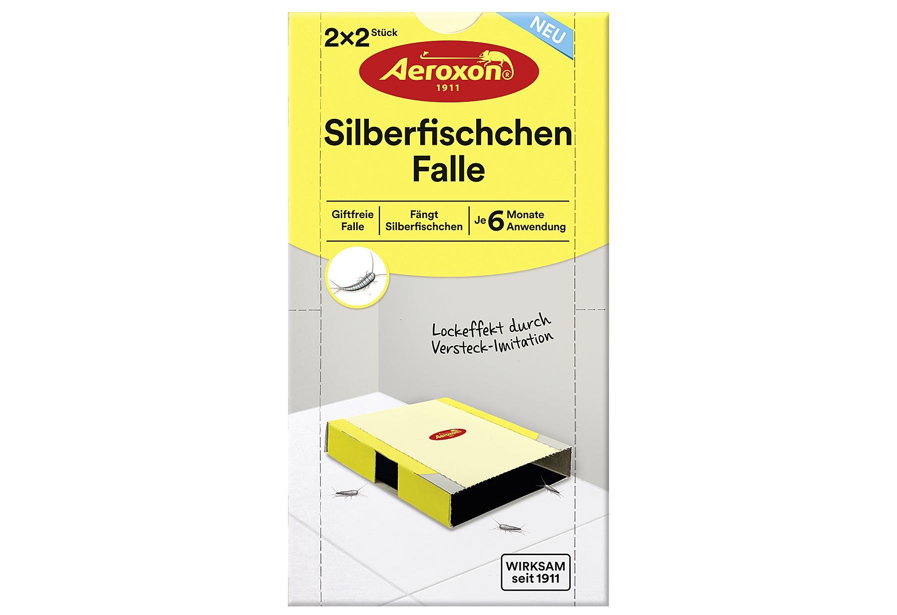 Die Aeroxon Silberfischen-Falle ist eine giftfreie und geruchlose Leimfalle zur Befallsermittlung von Silberfischchen. Die schwarze Fallenfarbe in Verbindung mit der Gehäuseform hat auf Silberfischchen einen starken Lockeffekt. Die Anwendungsdauer beträgt 2x6 Monate.