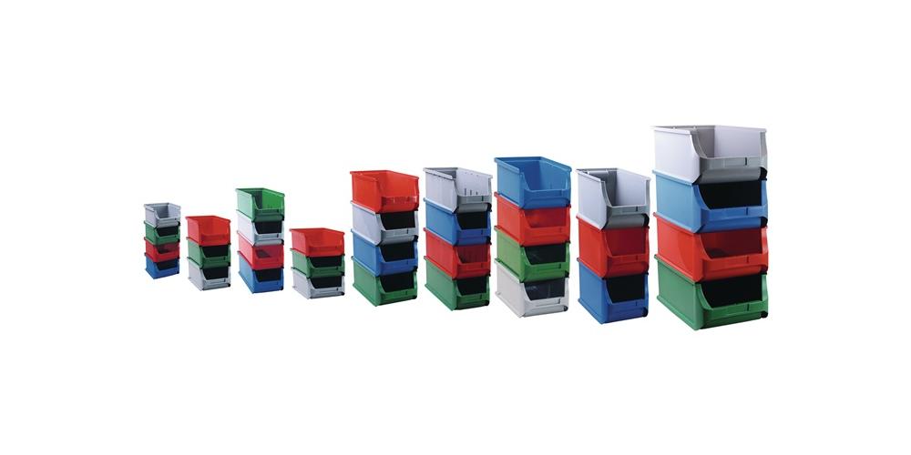 aus Polypropylen (PP), hochschlagfest · große Griffmulde an der Vorder- und Aufhängeleiste an der Rückseite (bis Größe 3) · Hohlkammerprofile am Eingriff sorgen für Formstabilität · sichere Stapelung durch umlaufenden Stapelrand und durchgehender Führungsschiene · Temperaturbeständig von -10 °C bis +60 °C · beständig gegen Harze, Laugen, Fette, Öle etc. · geeignet für Rollbänder durch glatten Unterboden· Lieferung erfolgt ohne Etiketten