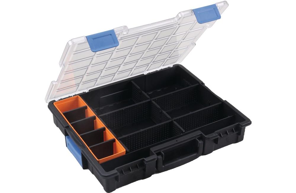 B 440 x T 355 x H 76 mm · Innenmaß B 400 x T 320 x H 60 mm · Kunststoff (PP/PS) · schwarz, mit transparentem, fest schließenden Deckel · individuelle Aufteilung durch herausnehmbare Trennstege · Verbindungsverschluss ermöglicht den Transport von bis zu 3 SortimentskästenAttribute