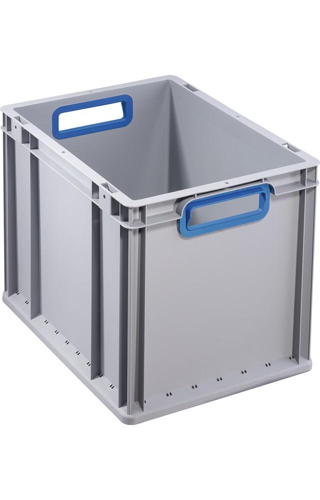 ALLIT Transportstapelbehälter L400xB300xH320mm grau PP offener Griff blau Seitenwände geschlossen