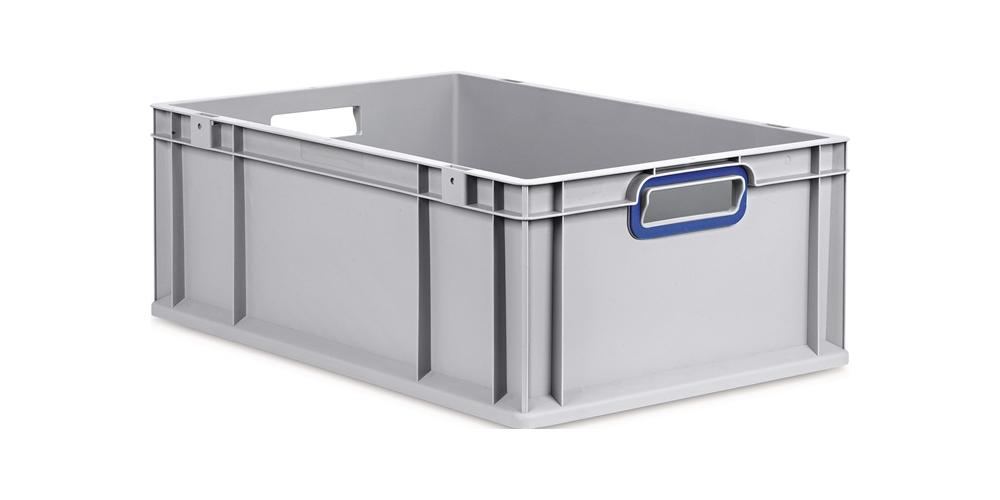 grau · formstabiles Polypropylen · rippenverstärkte Wände · abgestimmt auf Europaletten-Maße · selbstzentrierender, umlaufender Stapelrand · optimale Reinigung durch glatte Innenwände · widerstandsfähig gegen die meisten Säuren und Öle · Temperaturbeständig von -10 °C bis +60 °C · geschlossene Wände · blauer, offener GriffWeitere technische Eigenschaften:
