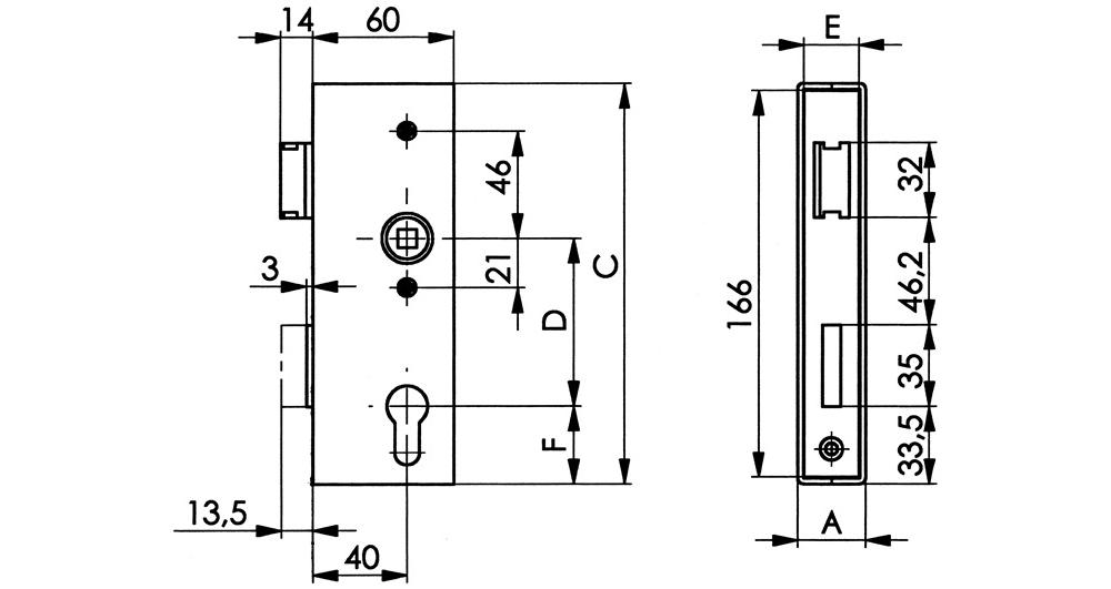 AMF Schlosskasten 141U, blank DIN links / rechts Maß A30xB60xC172 mm Dornmaß 40 mm