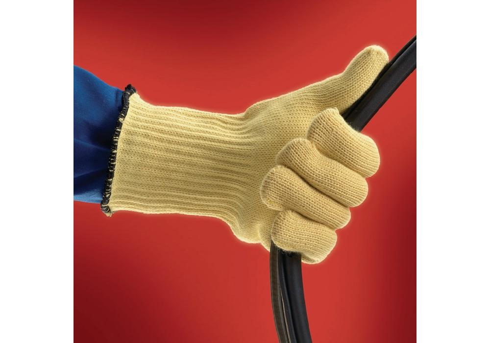 nach EN 388 · EN 407 · Kat. III · Material: Baumwolle / Kevlar® · gestrickt · langer Strickbund · für präziseste Arbeiten unter Hitzebedingungen · Schnittschutzlevel E · Kontakthitzefestigkeit Level 3 · herausragende Schnitt-, Weiterreiß- und Abriebfestigkeit · weich, komfortabel und absorbierend · silikonfrei · kurzfristiger Kontakt bei trockener Hitze bis zu 350 °C · Anwendung: Handhabung von Heißglas, Entnahme von sterilisierten Produkten aus Autoklaven, Entformen von Thermokunststoffen, ReifenproduktionWeitere technische Eigenschaften: