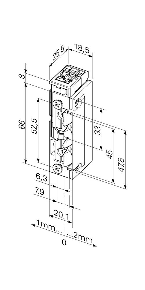 Modell mit bipolarer Schutzdiode · Rückmeldekontakt als potentialfreier Wechselkontakt, der von der Schlossfalle betätigt wird · Radiusfalle · FaFix® 3 mm verstellbar · Universalspannungen, kompatibel zu gängigen Einsteckschlössern · kompatibel zu ProFix® 2 Schließblechen · symmetrische Bauform · DIN links/rechts, sowie waagerecht einsetzbarWeitere technische Eigenschaften: