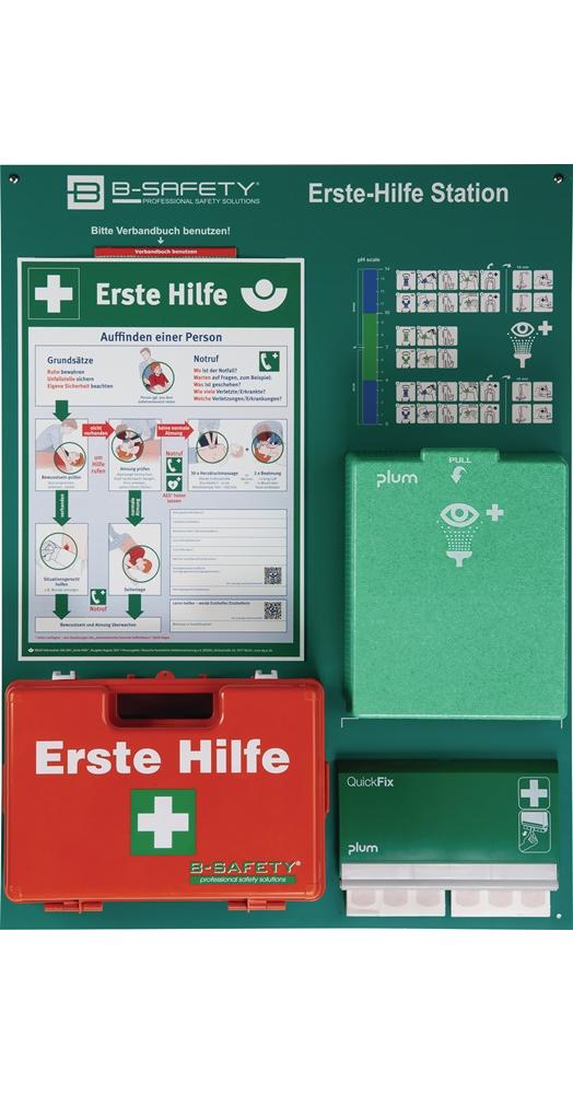 Lieferumfang: Verbandbuch, Erste-Hilfe Koffer, Augenspülstation und Pflasterspender. inkl. Befestigungsmaterial für Wandmontage