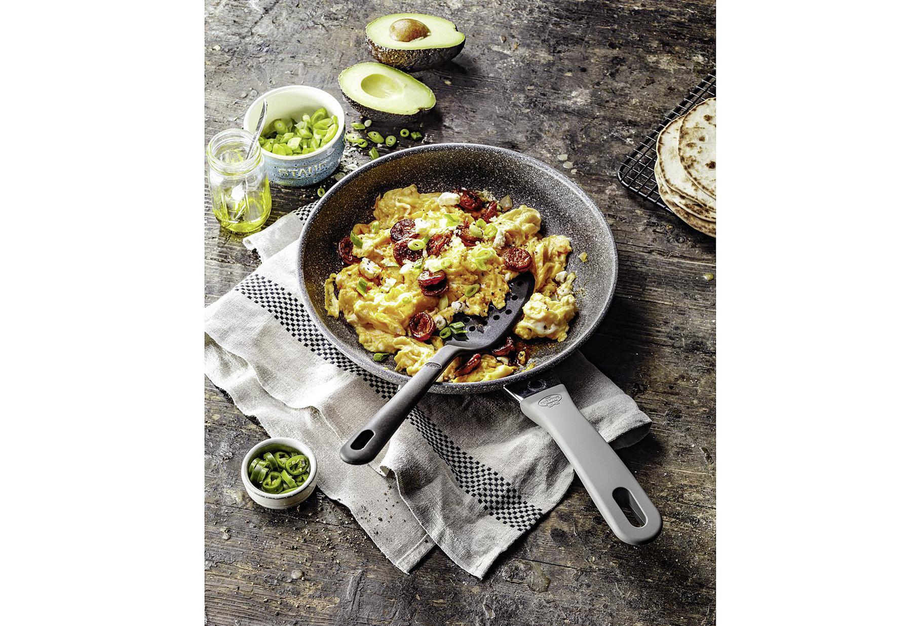 Ab jetzt ist die Bratpfanne aus der Serie Murano von BALLARINI deine „fidanzata“, deine feste Freundin, am Herd. Denn du wirst täglich mit ihr braten und kochen. Entwickelt wurde das schöne Design des Kochgeschirrs im Granit-Look vom Mailänder Studio Matteo Thun & Antonio Rodriguez. Kratzfest und einfach zu reinigen ist die Pfanne dank der langlebigen, mit Mineralpartikeln verstärkten 5-Lagen-Antihaftbeschichtung GRANITIUM Extreme. Spülmaschinengeeignet ist die Pfanne dabei ebenfalls. Dennoch empfehlen wir die sanftere Reinigung von Hand, um eine ideale Langlebigkeit zu garantieren. Das hochwertige Material aus massivem, geschmiedetem Aluminium spart wertvolle Zeit beim Aufheizen. Induktionsgeeignet? Auf jeden Fall! Wenn du einen Induktionsherd hast, kannst du sogar zusätzlich Energie sparen, denn der Radiant Induktion Boden verteilt die Wärme ideal und spart somit Energie. Der praktische Thermopoint am Stiel wechselt die Farbe, wenn die ideale Brattemperatur erreicht ist. Rührei nur für dich? Aber „certo“! Mit 20 cm Durchmesser hat die Pfanne die perfekte Größe für Single-Portionen oder den kleinen Hunger. Egal, was du kochen oder aufwärmen möchtest. Auch perfekt, wenn eine Zutat einzeln angebraten werden soll, ohne gleich eine große Pfanne schmutzig zu machen.Attribute