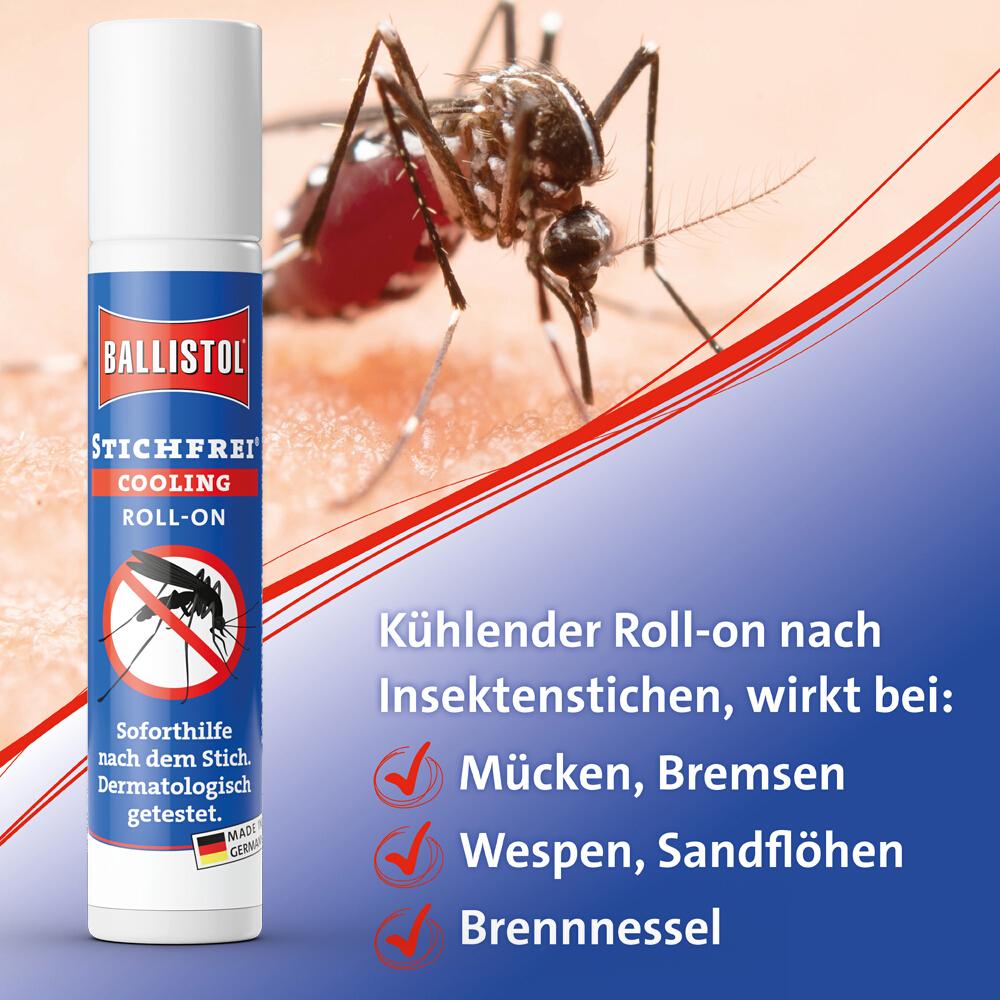 - Mückenstiche, Wespenbisse oder Hautreizungen durch Brennnesseln – Juckreiz und Hautirritationen können den Tag schnell vermiesen. Mit dem BALLISTOL Stichfrei Cooling Roll-on haben Sie die perfekte Lösung immer griffbereit! Der handliche Roll-on kühlt sofort, lindert den Juckreiz und unterstützt die Regeneration der Haut.