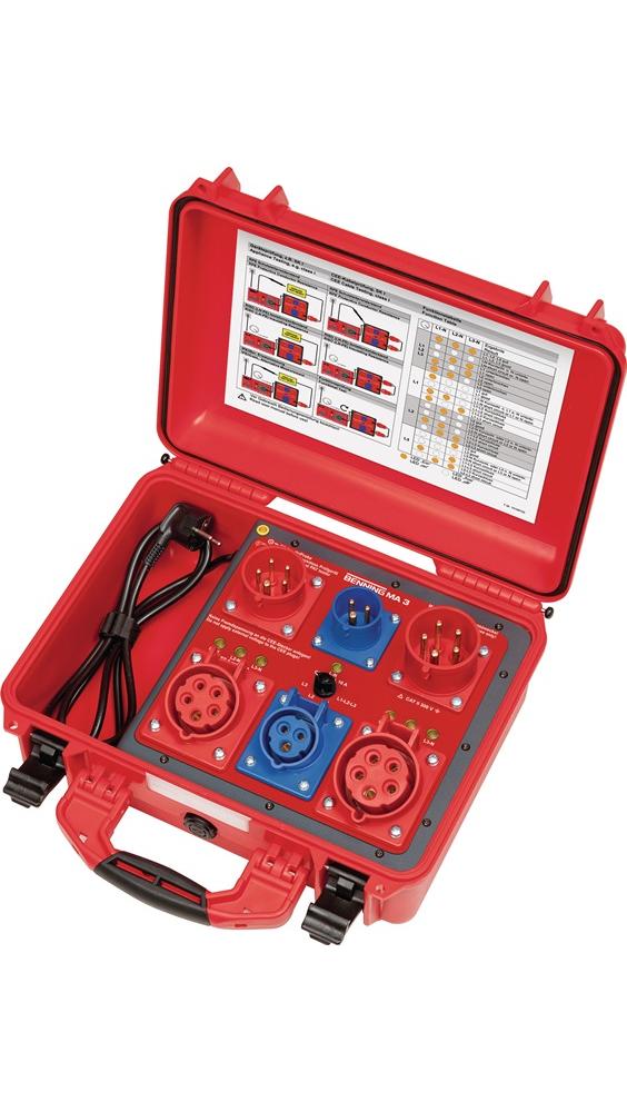 zur Prüfung von CEE-Verlängerungsleitungen und passiven Prüfung 1-phasiger und 3-phasiger Geräte · passend für die Gerätetester BENNING ST 725, ST 750 A, ST 755, ST 755+, ST 760 und ST 760+ · 16 A CEE 3-polig, 16 A/32 A CEE 5-polig · ermöglicht in Verbindung mit den Gerätetestern die Prüfung von RPE Schutzleiterwiderstand, RISO Isolationswiderstand, IPE/IBER Schutzleiter- und Berührungsstrom im Ersatzverfahren und die Funktionsprüfung (Leitungsbruch, Kurzschluss) sowie die Drehfeldprüfung von CEE-Verlängerungsleitungen · robuster und staub-/wasserdichter Schutzkoffer IP 67Attribute