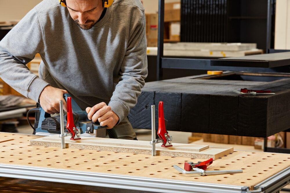 Innenausbau DIY Möbel- und Schreinerarbeiten Küchen- und Ladenbau Einhändig in Profilen und auf Tischen spannen