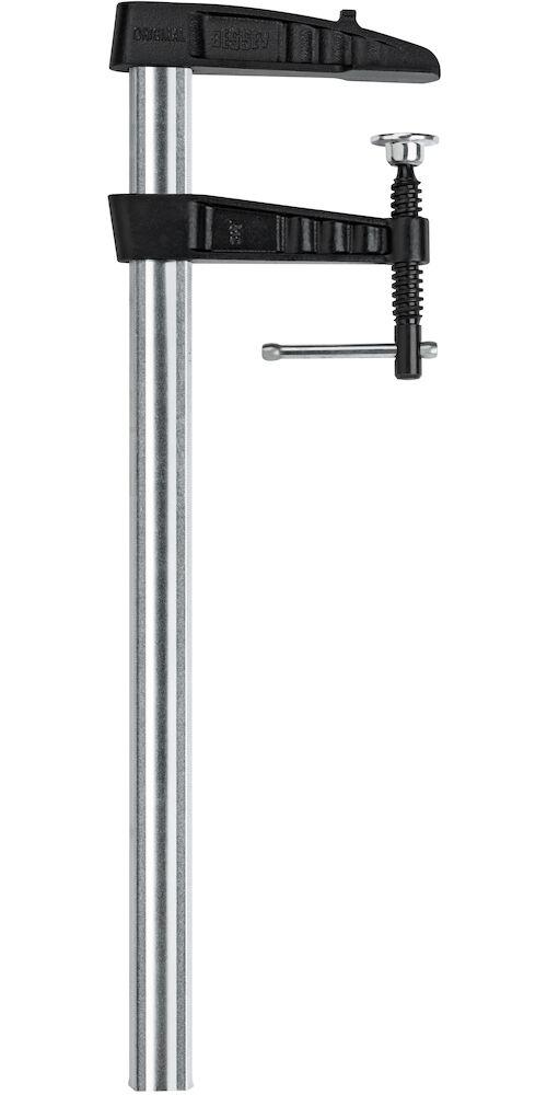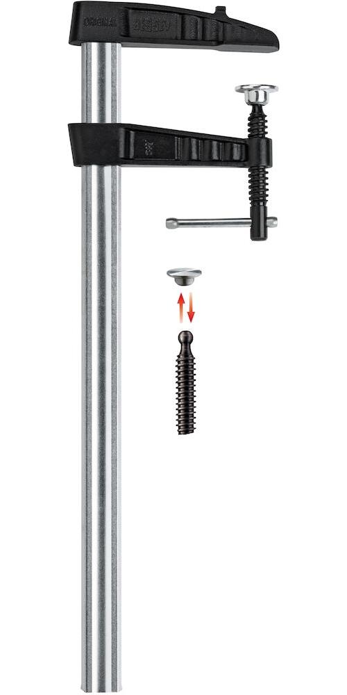 Spannkraft bis zu 7.000 N Verstärkte Ausführung für höhere Spannkraft und größere Spannweiten Knebelgriff mit abgerundeten Enden für einfache Kraftübertragung beim Anspannen Werkzeuglos wechselbare Druckplatten Stabile Hohlprofilschiene mit Riffelung BESSEY RutschsicherungText