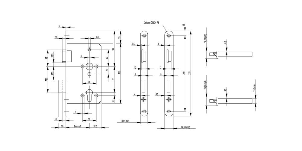 PZW Ausführung · nach DIN 18251-1 Klasse 3 · allseitig geschlossener Schlosskasten · 2-tourig · mit Wechsel · Stulplänge 235 mm · Entfernung 72 mm · Vierkant 8 mm · Falle und Riegel aus Zinkdruckguss · ohne Schließblech