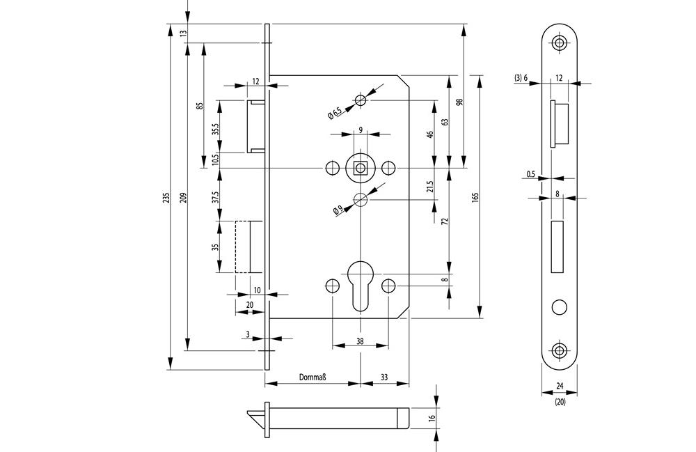 Panik-Wechselfunktion E · für einflügelige Holz- oder Stahltüren · in Kombination mit geprüften Beschlägen nach EN 179 (Notausgänge) und nach EN 1125 (Paniktüren) zugelassen ·Feuerschutzeignung · zweitourig · 1-teilige Nuss · vorgerichtet für Profilzylinder · Falle und Riegel aus Stahl · Entfernung 72 mm · Vierkant 9 mm · Stulplänge 235 mm · allseitig geschlossener Schlosskasten