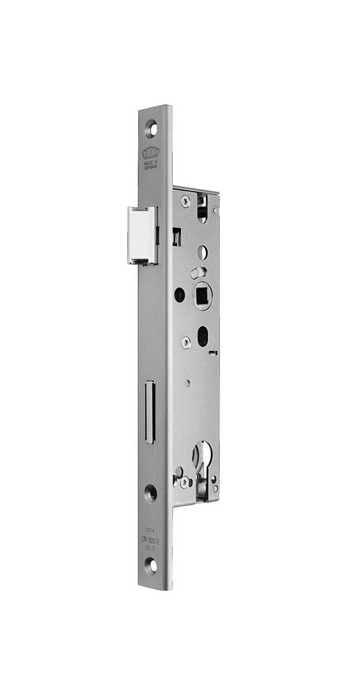 für einflügelige Türen · DIN links und rechts verwendbar durch umstellbare Falle · zugelassen nach DIN 18251-2 Klasse 3 · Falle und Riegel aus Zink-Druckguss · 20 mm Riegelausschluss, 1-tourig · Stulp Edelstahl matt · PZ · Entfernung 92 mm · 8 mm Vierkant · mit WechselWeitere technische Eigenschaften:
