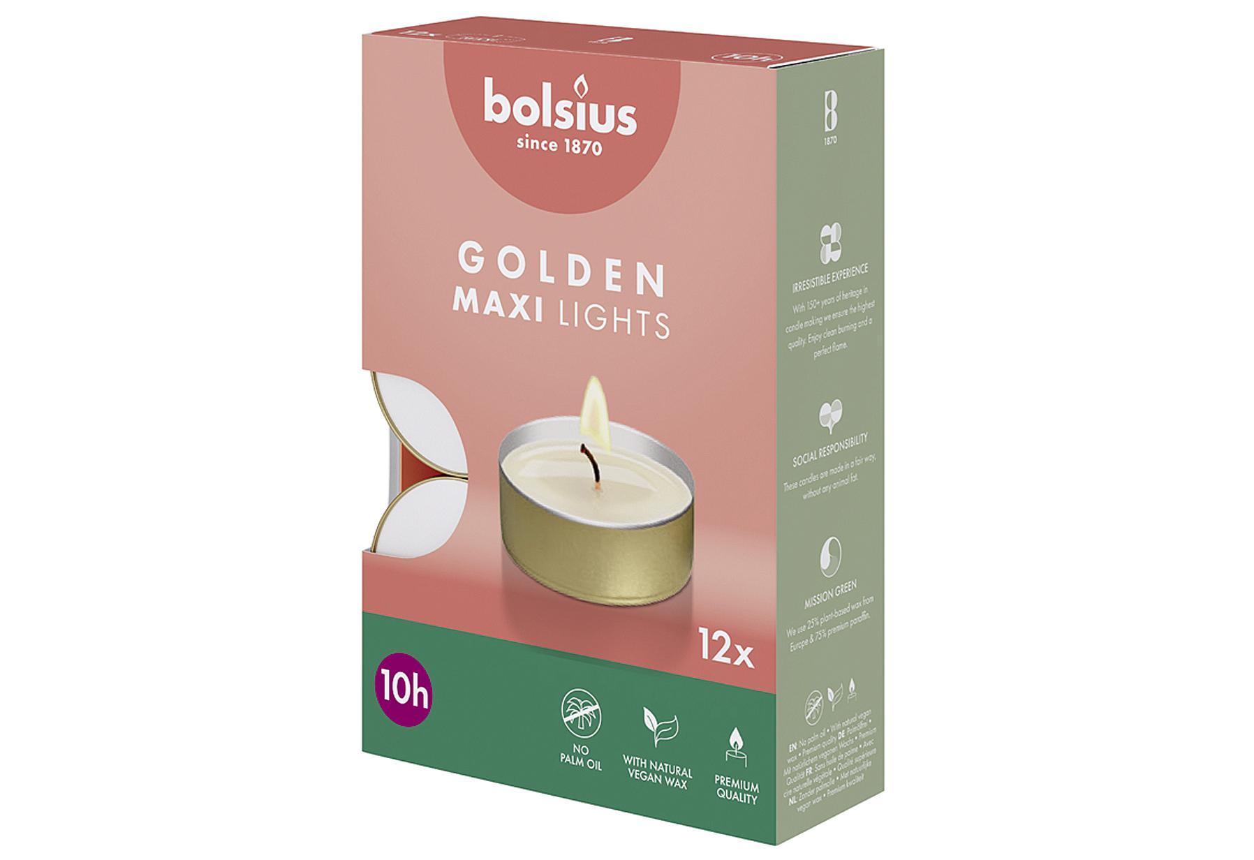 BOLSIUS Maxi Teelichte 10Stunden goldener Cup 12Stück• Lassen Sie eine brennende Kerze niemals unbeaufsichtigt. • Stellen Sie die Kerze nie in die Nähe von Gardinen oder anderen entflammbaren Objekten. Es handelt sich um offenes Feuer, daher ist immer besondere Vorsicht geboten. • Von Kindern und Haustieren fernhalten. • Platzieren Sie die Kerze auf einem nicht entflammbaren Untersetzer oder Kerzenhalter. • Halten Sie die Kerzen mindestens 10 cm voneinander entfernt. • Nicht in Zugluft brennen. • Nicht in der Nähe einer Wärmequelle aufstellen. • Stellen Sie die Kerze aufrecht. • Die Kerze nie ausblasen, sondern mit einem Kerzenlöscher löschen. • Das flüssige Wachs frei von Streichhölzern und Verschmutzungen halten. • Verwenden Sie niemals Flüssigkeit zum Löschen. • Nicht berühren, kann heiß sein. • Nicht in Wärmeeinheiten / Stövchen verwenden.