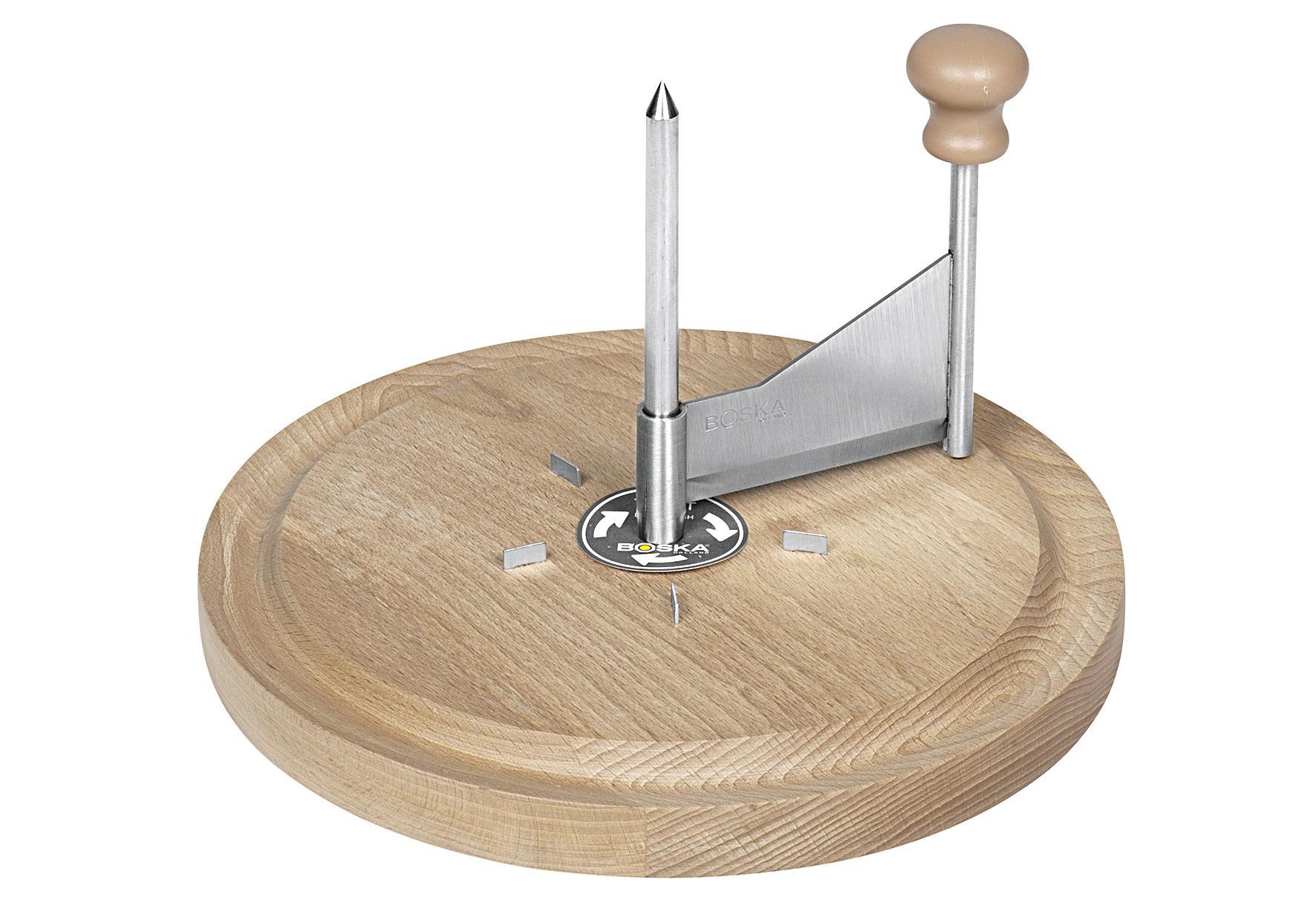 Mit prächtigen, geschmackvollen Käselocken sorgen Sie für die optimale Abrundung Ihrer Gerichte. Herrlich zu italienischer Pasta oder einem frischen Salat. Der Käseschaber Amigo mit Edelstahl-Messer eignet sich für Tête de Moine oder Schokolade. Dank der 5 Zapfen im Sockel bleibt der Käse für Sie besonders griffig liegen. Erfahren Sie es selber: Ihr Käse liefert perfekte Locken und Ihre Gerichte schmecken noch besser! Sie drehen spielerisch an der Handkurbel und der Käseschaber schabt wie von selber prachtvolle Käselocken. Sofort bereit, um stimmungsvoll serviert zu werden. Verwenden Sie die Glocke, um die Aromen des Käses zu bewahren. So bleibt der Käse auch länger frisch. Der Käseschaber lässt sich einfach montieren und demontieren. So nimmt er wenig Platz ein und ist im Handumdrehen wieder auf dem Tisch. Wählen Sie den leckeren Tête de Moine aus der Schweiz zu einem Glas Sherry. Für Süßmäuler legen Sie ein kräftiges Stück Schokolade auf den Käseschaber Amigo. Einfach genießen! Drehen Sie den Käseschaber im Uhrzeigersinn und nehmen Sie Käse, der frisch aus dem Kühlschrank kommt. Der Geschmack ist herrlich!Attribute
