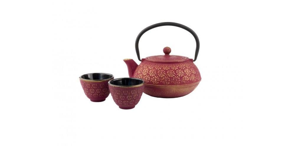 Für Liebhaber des japanischen Tees ein wundervolles Geschenk! Die gusseiserne Teekanne wird einschließlich zweier gusseisener Tassen in einer schönen Geschenkverpackung geliefert. Sowohl die Teekanne als auch die Tassen haben eine emaillierte Innenseite. Die Teekanne fasst 0,6 Liter und wird mit einem Edelstahlfilter geliefert. Die Ausführung in matt pink mit goldenen Verzierungen sieht dabei sehr stilvoll aus.Lieferumfang:
