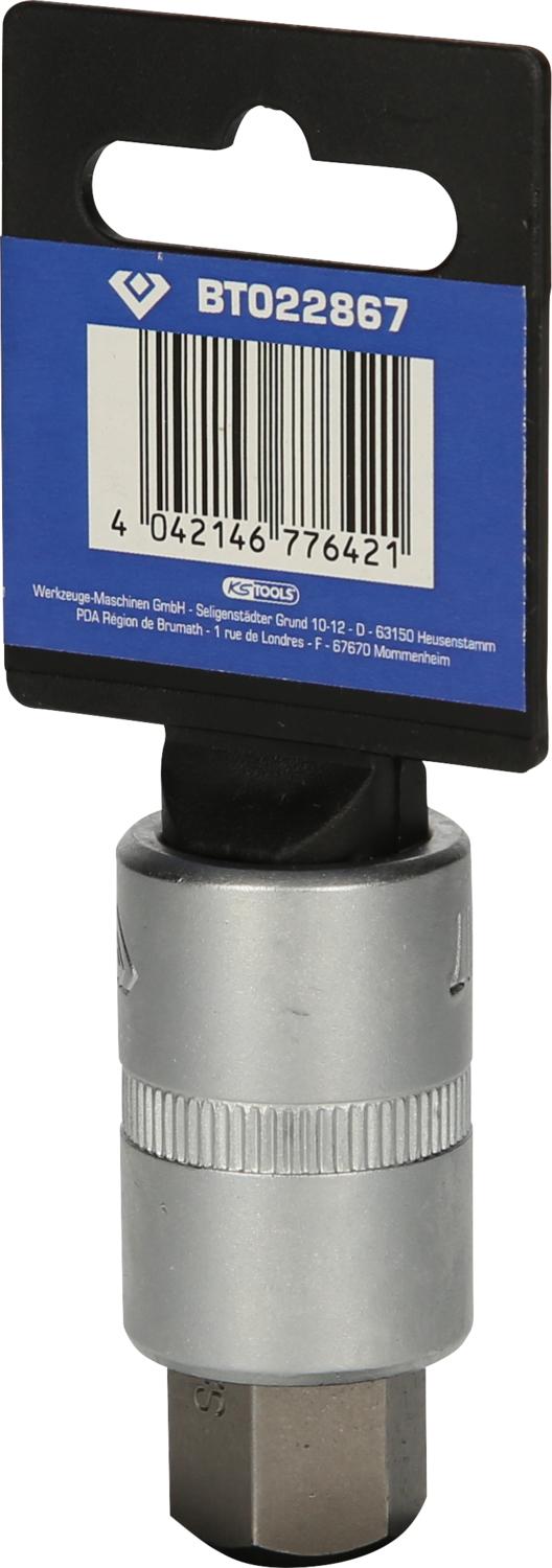 Die BRILLIANT TOOLS Innensechskant-Bit-Stecknuss BT022867 hat einen 1/2" (12,5 mm) Innenvierkant-Antrieb, der nach DIN 3120 gefertigt ist. Der eingepresste phosphatierte Bit hat die Größe 17. Die Bit-Stecknuss hat eine Gesamtlänge von 55 mm, die Klingenlänge beträgt 17 mm. Die Oberfläche ist an der Antriebsseite und an der Bitseite matt verchromt, diese ist durch eine Längsrändelung getrennt.