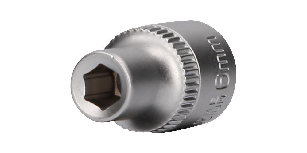 Die BRILLIANT TOOLS Sechskant-Stecknuss BT021800 ist nach DIN 3124 gefertigt. Der kurze metrische Einsatz hat einen 3/8" (10 mm) Innenvierkant-Antrieb welcher nach DIN 3120 gefertigt wurde. Die Schlüsselweite des Sechskants ist 6 mm. Die Stecknuss hat eine Gesamtlänge von 28 mm. Die Oberfläche ist an der Antriebsseite und an der Innensechskantseite matt verchromt, diese ist durch eine Längsrändelung getrennt.
