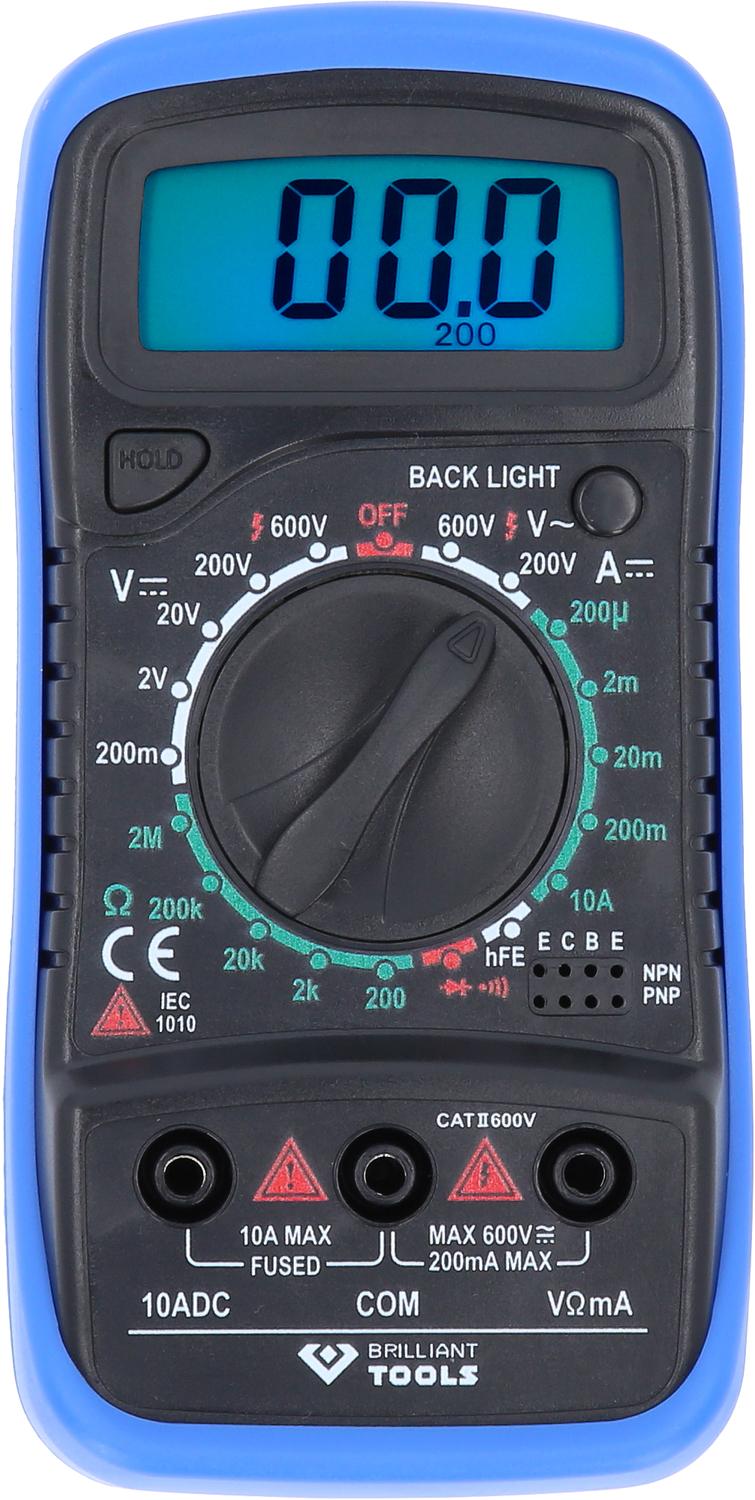 Der BRILLIANT TOOLS Multimeter BT122900 ist ein kompakter Multimeter für alle gängigen Messaufgaben im Haus- und Hobbybereich. Er misst sicher, schnell und präzise in den Bereichen Spannung, Strom und Widerstand und verfügt über eine Diodentest-Funktion zur Funktions- und Polaritätsbestimmung.