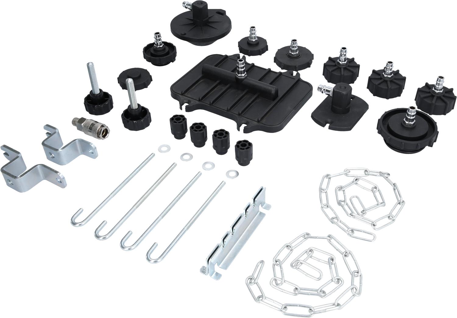 Der 20-teilige BRILLIANT TOOLS Universal-Adaptersatz BT701220 ist universell einsetzbar zum Entlüften von Brems- oder Kupplungssystemen. Die Kunststoffadapter mit einer 1/4" (6,3 mm) Schnellverschlusskupplung ausgestattet. Somit können sie mit den meisten Bremsenentlüftungsgeräten kombiniert werden. Die spezifischen Adapter sind für Fahrzeuge von Audi, BMW, Chrysler, Ford, Honda, Nissan, Opel und VW geeignet. Die 2 Universal-Kegeladapter können mittels einer Kette am Ausgleichsbehälter befestigt werden. Die Kette wird mit zwei Rändelschrauben gespannt.