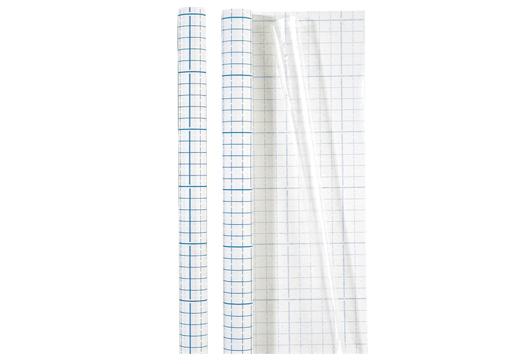 Polypropylen, selbstklebend, säurefrei, 60 Mµ, mit Gitterlinien auf der Abziehseite für exaktes, sparsames Zuschneiden, mit seitlichem Schlitz zum besseren Ablösen des Papierträgers