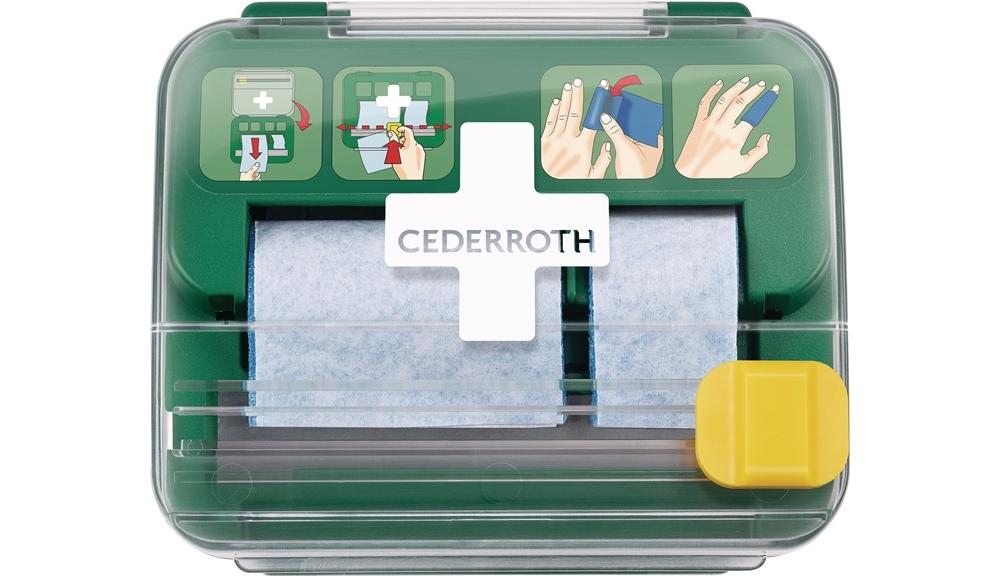 enthält zwei Rollen Soft Foam Bandage Blue in verschiedenen Breiten · für die schnelle und einfache Versorgung kleinerer Wunden (6 cm x 4,5 m und 3 cm x 4,5 m) · integriertes Messer für eine einfache Anwendung · kompakte Größe · lässt sich auch in kleinen Räumen leicht an der Wand montieren · abschließbar · transparente AbdeckungWeitere technische Eigenschaften: