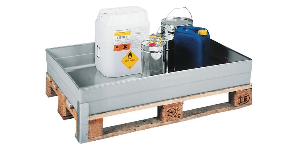 Auffangvolumen 150 l · aus glasfaserverstärktem Kunststoff · mit hoher chemischer Beständigkeit und Stabilität · UV-stabil · durch Korrosionsbeständigkeit dürfen die Wannen direkt auf den Boden gestellt werden · bei geringem Eigengewicht (ca. 9 kg) auf Europalettenmaß abgestimmt · Befestigung auf der Palette über Befestigungswinkel an den Palettenaußenseiten · für 2 x 150-Liter- oder 6 x 60-Liter-Fässer geeignet · Mit bauaufsichtlicher Zulassung Z-40.12-227 des DIBt Berlin für die vorschriftsmäßige Lagerung von stark gewässergefährdenden Stoffen.Weitere technische Eigenschaften: