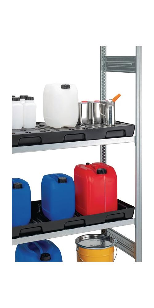 für Kleingebinde · zur sicheren und vorschriftsmäßigen Lagerung gewässergefährdenden Flüssigkeiten der GHS-Kategorien 1-4 · aus Polyethylen · sehr beständig gegen Laugen, Öle und Säuren · ohne PE-Rost · stapelbar · konzipiert für verschiedene Regaltiefen · mit DIBT-Zulassung Nr. Z-40.22-601Weitere technische Eigenschaften: