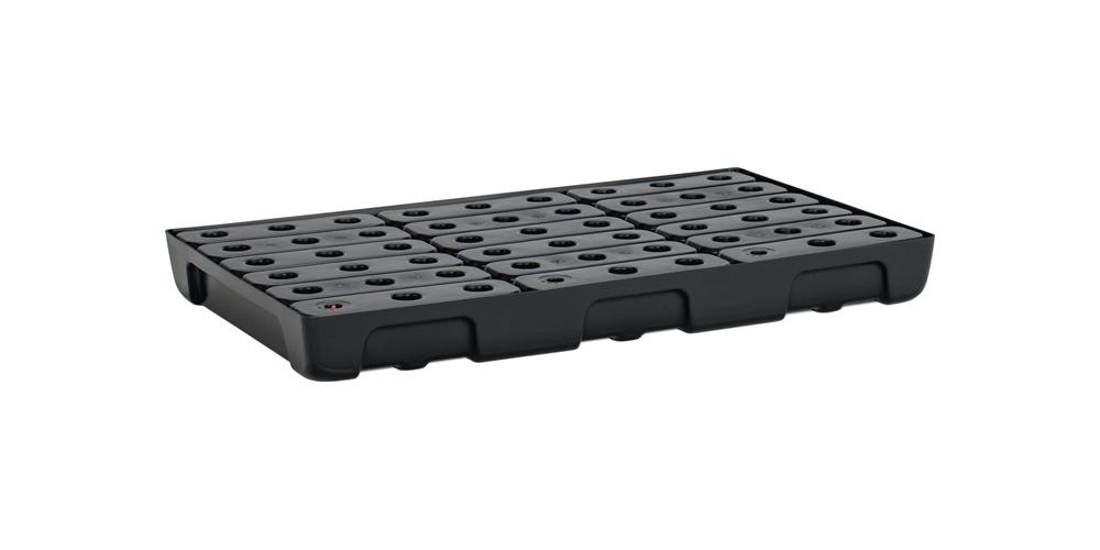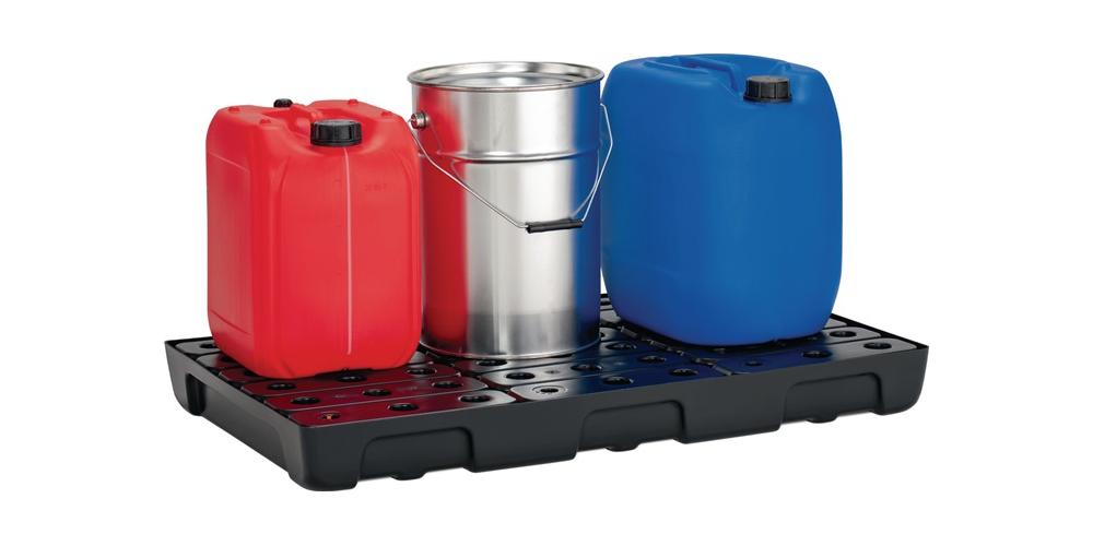 für Kleingebinde · zur sicheren und vorschriftsmäßigen Lagerung gewässergefährdenden Flüssigkeiten der GHS-Kategorien 1-4 · aus HD-Polyethylen · sehr beständig gegen Laugen, Öle und Säuren · mit PE-Rost · stapelbar · konzipiert für verschiedene Regaltiefen · mit DIBT-Zulassung Nr. Z-40.22-601