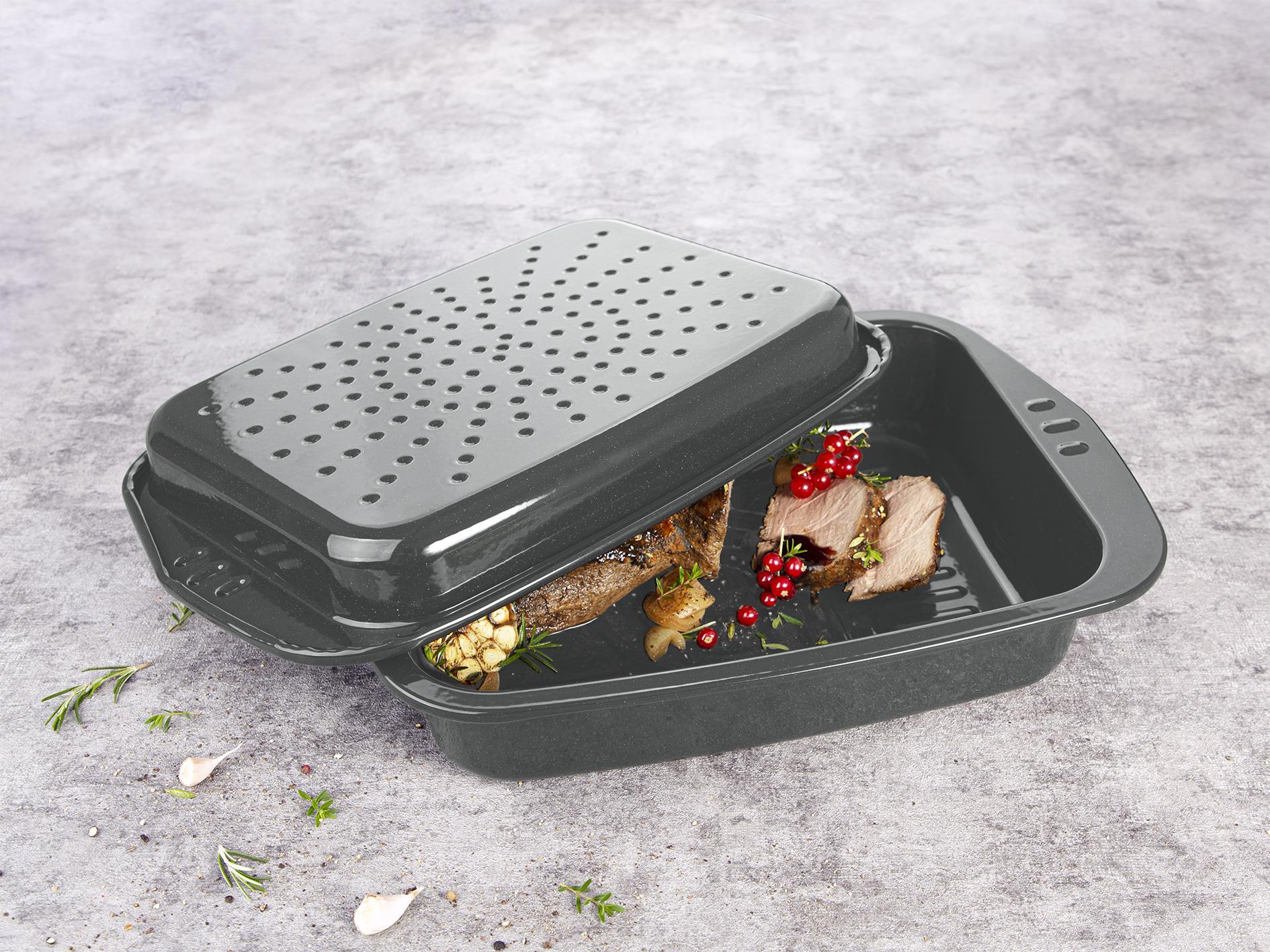 inkl. Deckel, extra tief mit Strukturboden, mit versetzten Griffen zum besseren Handling, hochwertig emailliert, Bräter in Materialstärke 0,75 mm, Deckel in Materialstärke 0,50 mm, hitzebeständig 400 °C, schnittfeste Oberfläche, Deckel kann auch als flacher Bräter oder Grillform genutzt werden, Deckel mit Kondenswasserführung, ca. 39,0 x 28,0 x 4,0 cmAttribute