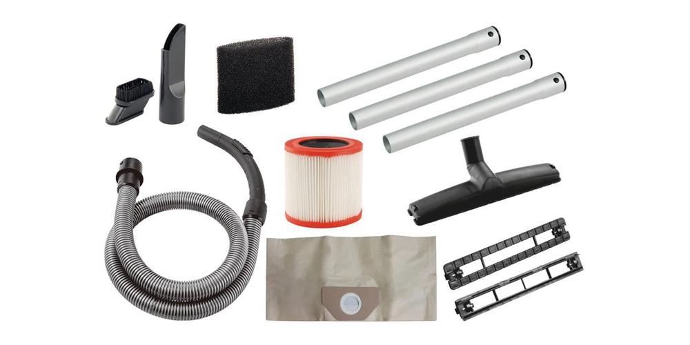 Lieferumfang: Schwammfilter, Bodendüse nass/trocken, Flachdüse inkl. Bürstenaufsatz, Kartuschenfilter, Saugschlauch 2 m inkl. Griffstück mit Fehlluftregulierung, 3x Aluminiumsaugrohr Ø32mm Länge je 330 mm, Papierfilterbeutel