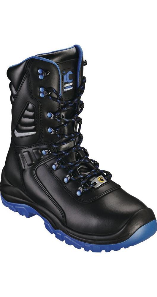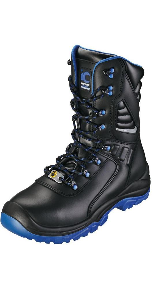 nach DIN EN ISO 20345 · S3S FO SR ESD · Schaft aus Glattleder · ergonomisch gepolsterter Kragen · gepolsterte Staublasche · Verschluss durch Schnellschür-Ösen mit Rundsenkeln · atmungsaktives Innenfutter · herausnehmbare, anatomische High-Poly Einlegesohle · Reflexstreifen · Kunststoffkappe und durchstichsichere Gewebezwischensohle · antistatische, öl- und säurebeständige, rutschhemmende 2-Schichten-PU-Laufsohle · blaue Laufsohle, nicht kreidend · Schafthöhe ca. 25 cm · Weite: 11Weitere technische Eigenschaften: