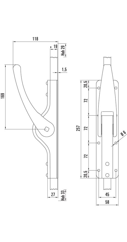 neutrales Design für alle baulichen Voraussetzungen · alle Kanten gerundet · für Vierkantstangen · Getriebekasten aus Stahl 1,5 mm tiefgezogen, galvanisch verzinkt · stabile GetriebeteileWeitere technische Eigenschaften: