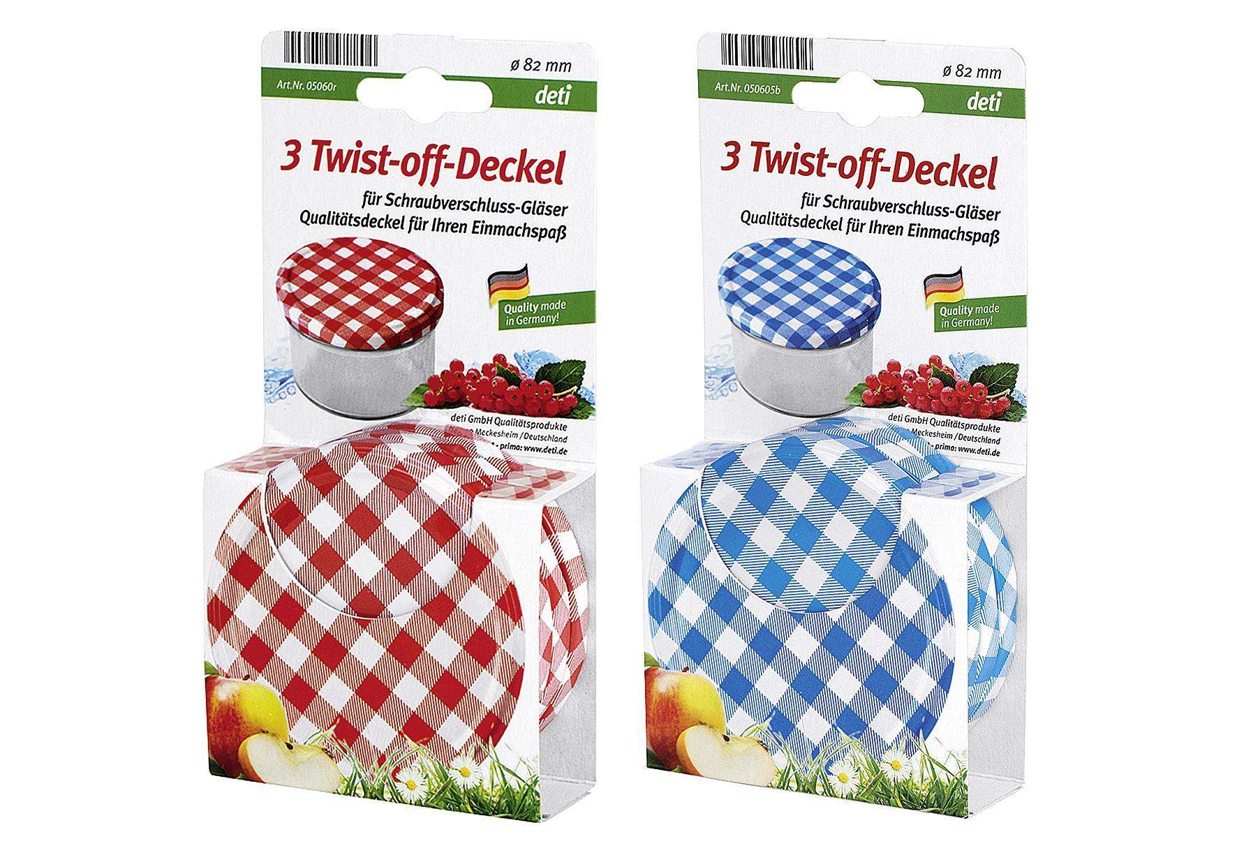 Qualitäts Twist-off-Deckel für Einmachgläser 3er Set, 82 mm Ø, Weißblech, Blue Seal, PVC frei, Farbe: rot/weiß kariert.Lieferumfang: