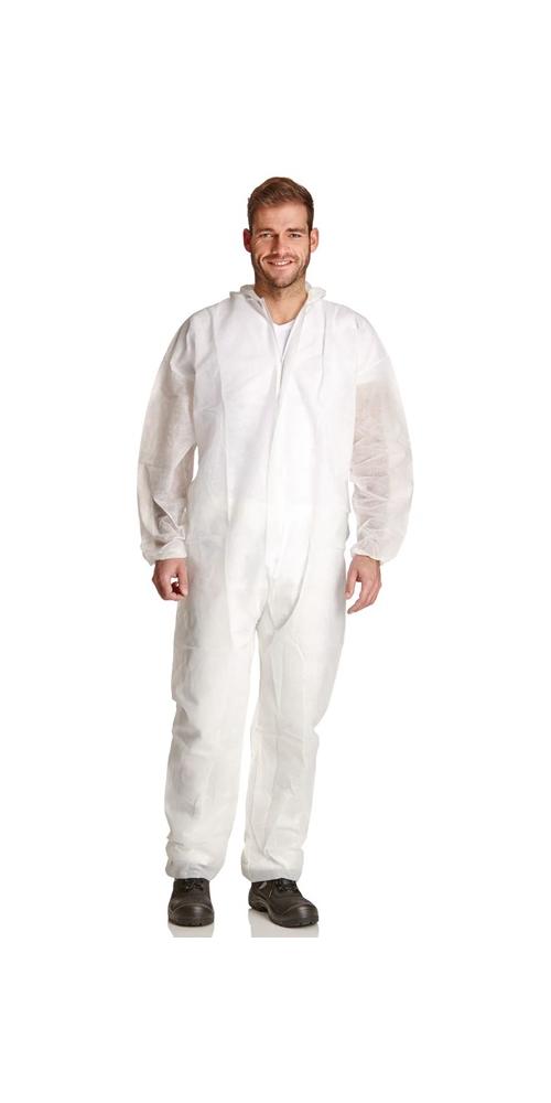 praktischer Maleroverall aus Polypropylen PP · mit Kapuze · Gummizügen an Armen, Beinen und Taille · gute Passform · mit Reißverschlussabdeckung· atmungsaktives Material · 40 g/m² · hoher Tragekomfort · CE Kat. IWeitere technische Eigenschaften: