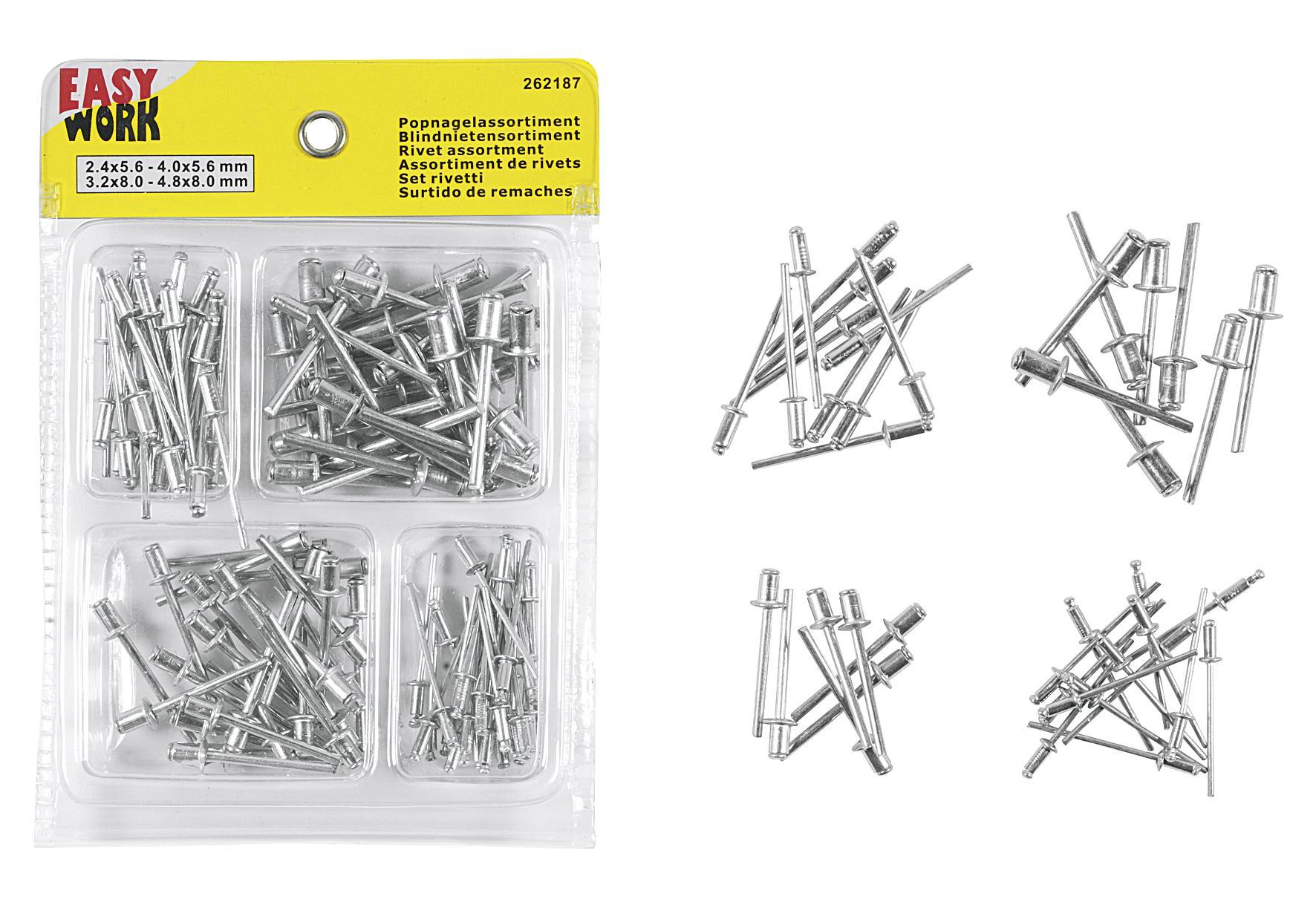 passend für alle gebräuchlichen Blindnietzangen, je 25 Stück Ø 4,8 x 6 mm, Ø 4 x 6 mm, Ø 3,2 x 6 mm, Ø 2,4 x 6 mm | Blind rivets / Les rivets aveugles / Popnagels / Nity jednostronnie zamykane, zestaw / Slijepe zakovice, izbor od komada / Slepe kovice asrotiman / rivettiLieferumfang:
