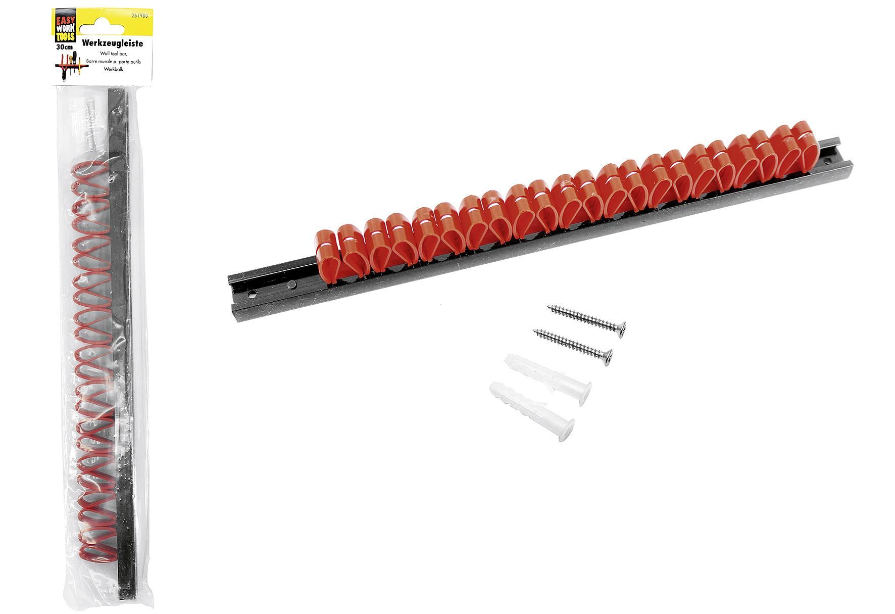 300 mm, Nylon-rot, Kunststoff-Fuß, Weite 19 mm, mit Schrauben | Wall tool bar / Barre murale p. porte-outils / Werkbalk / Listwa narzedziowa / Sina za kacenje alata / Sina za alata / Asta murale portautensiliWichtiger Warnhinweis beim Bohren in Wänden: Stellen Sie sicher, dass sich keine Gas-, Wasser- oder Stromleitungen an der Bohrstelle befinden. Die Montage sollte nur durch fachkundiges Personen erfolgen. Achten Sie auf die Wandbeschaffenheit, da das beigefügte Befestigungsmaterial nicht für alle Wandarten geeignet ist. Erkundigen Sie sich im Handel nach passenden Schrauben und Dübeln. Der Hersteller übernimmt keine Haftung für Schäden durch unpassende Wand-Dübel-Verbindungen.