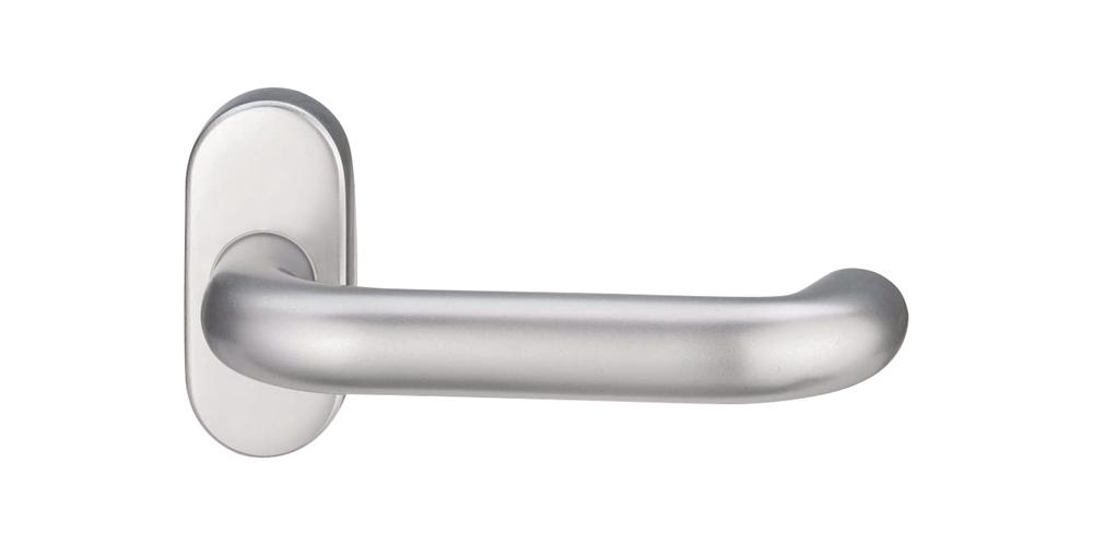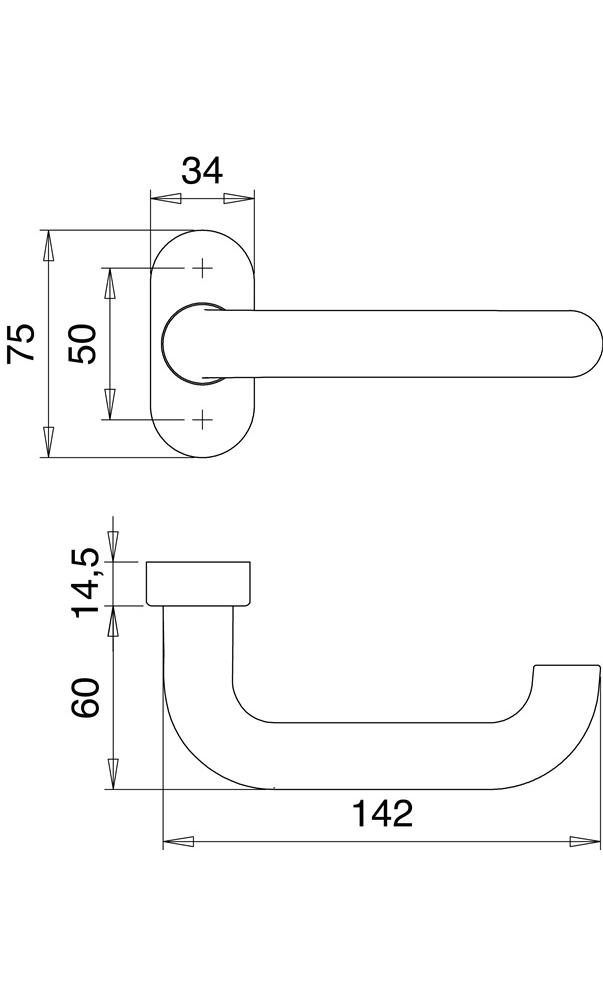 für Feuerschutzrahmentüren · gerade · fest-drehbar auf ovaler Rosette · mit Hochhaltefeder · Rosette Stärke 14,5 mm · Höhe 75 mm · Breite 34 mm · verdeckte Verschraubung · Norm DIN 18273 / DIN EN 1906Weitere technische Eigenschaften: