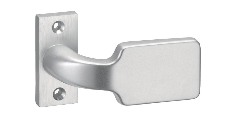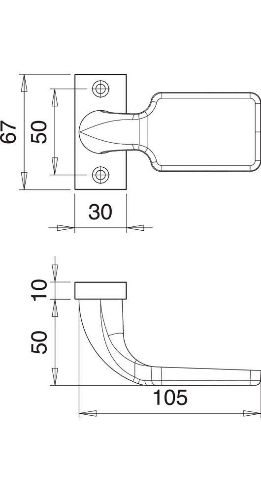 für Rahmentüren · schräg, auf kantiger Rosette · ohne Stift · Schraublochabstand 50 mm · Kanten gerundet · Höhe 67 mm · Breite 30 mm · Stärke 10 mm · sichtbare Verschraubung · fest oder fest/drehbar (federnd gelagert) · DIN links / rechts · Lieferung ohne Stift und SchraubenWeitere technische Eigenschaften: