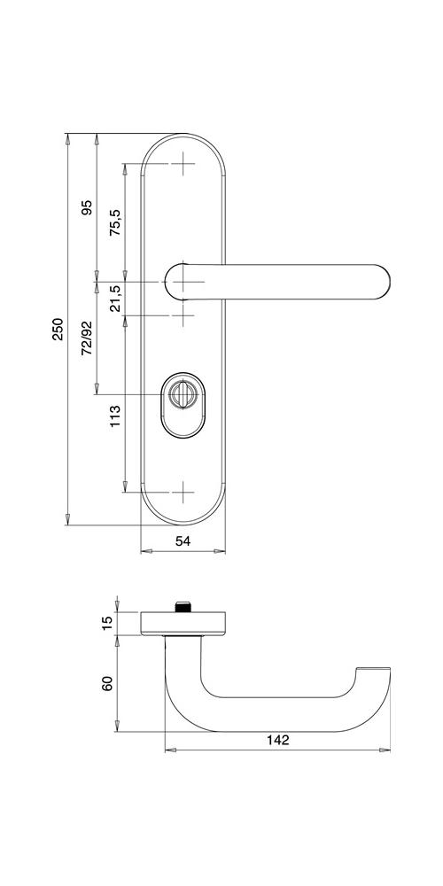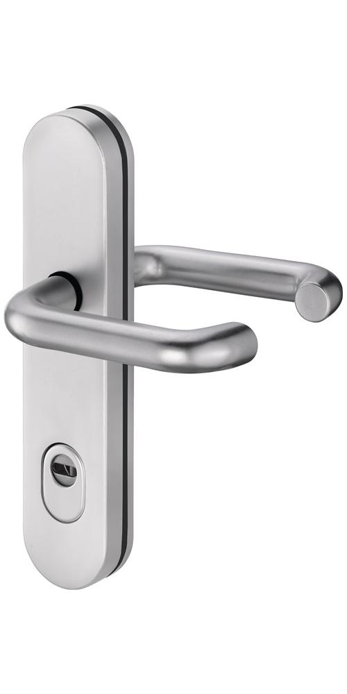 Grundkonstruktion: Druckguss mit 2 mm Teilstahleinlage im Außenschild, oberflächengehärtet · Stärke Innenschild = 8 mm · Drücker-Lagerung: lose · Drückertyp und -stärke: 103 mit Ø 22 mm, bzw. bei Alu 8 mm VKT = 104 mit Ø 18 mm · Knopfausführung bei Wechselgarnitur: Modell …/0272 und …/0292 = K2 (gekröpft), bzw. Modell …/0772 und …/0792 = K7 (gerade) · Stütznocken: M6, Ø 10 mm anbohrgeschützt · Verschraubung: 3-fach M6, verdeckt · Anbohrschutz beim Außenschild · Wechselgarnituren mit Spezialrollenwechselstift mit M12-Gewinde · mit Zylinderabdeckung: federnd gelagert für 12 - 17 mm Überstand · DIN links / rechts · Widerstandsklasse ES1Weitere technische Eigenschaften: