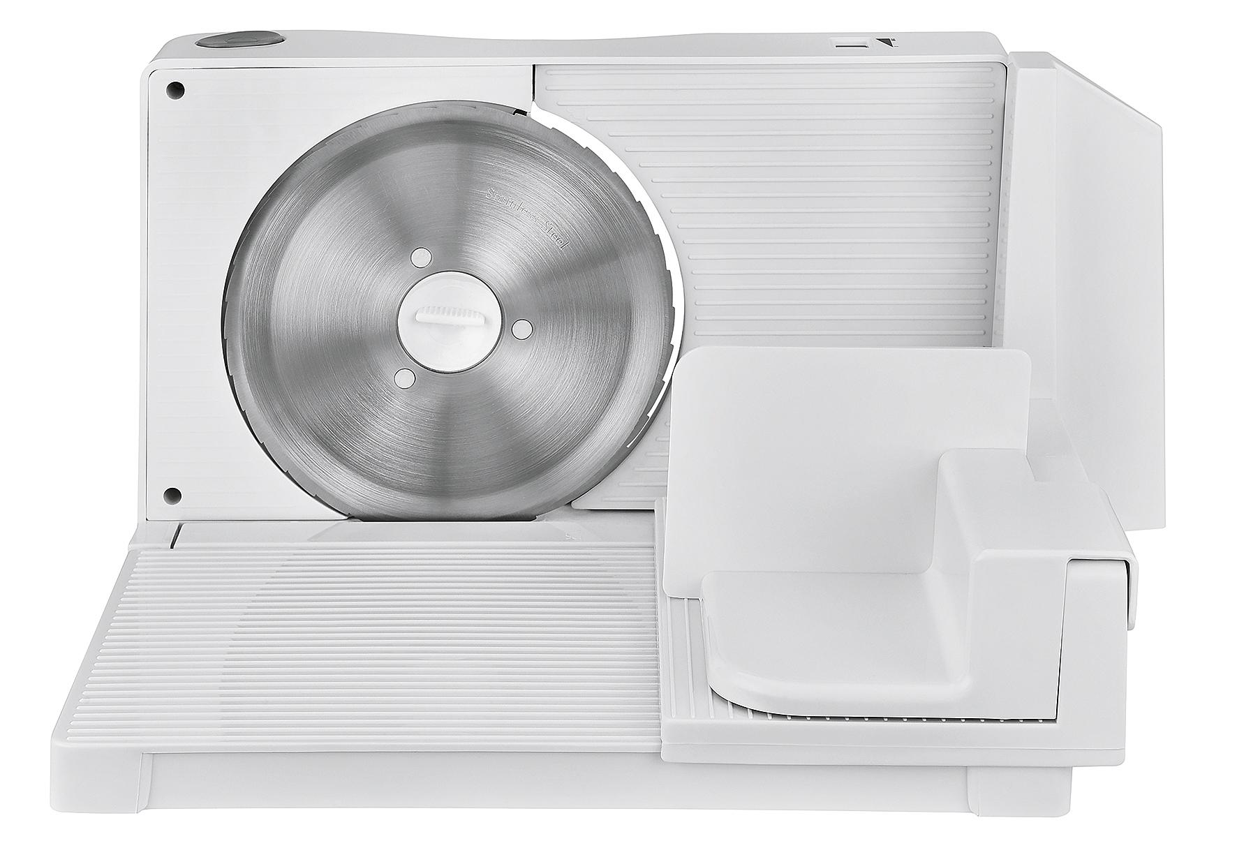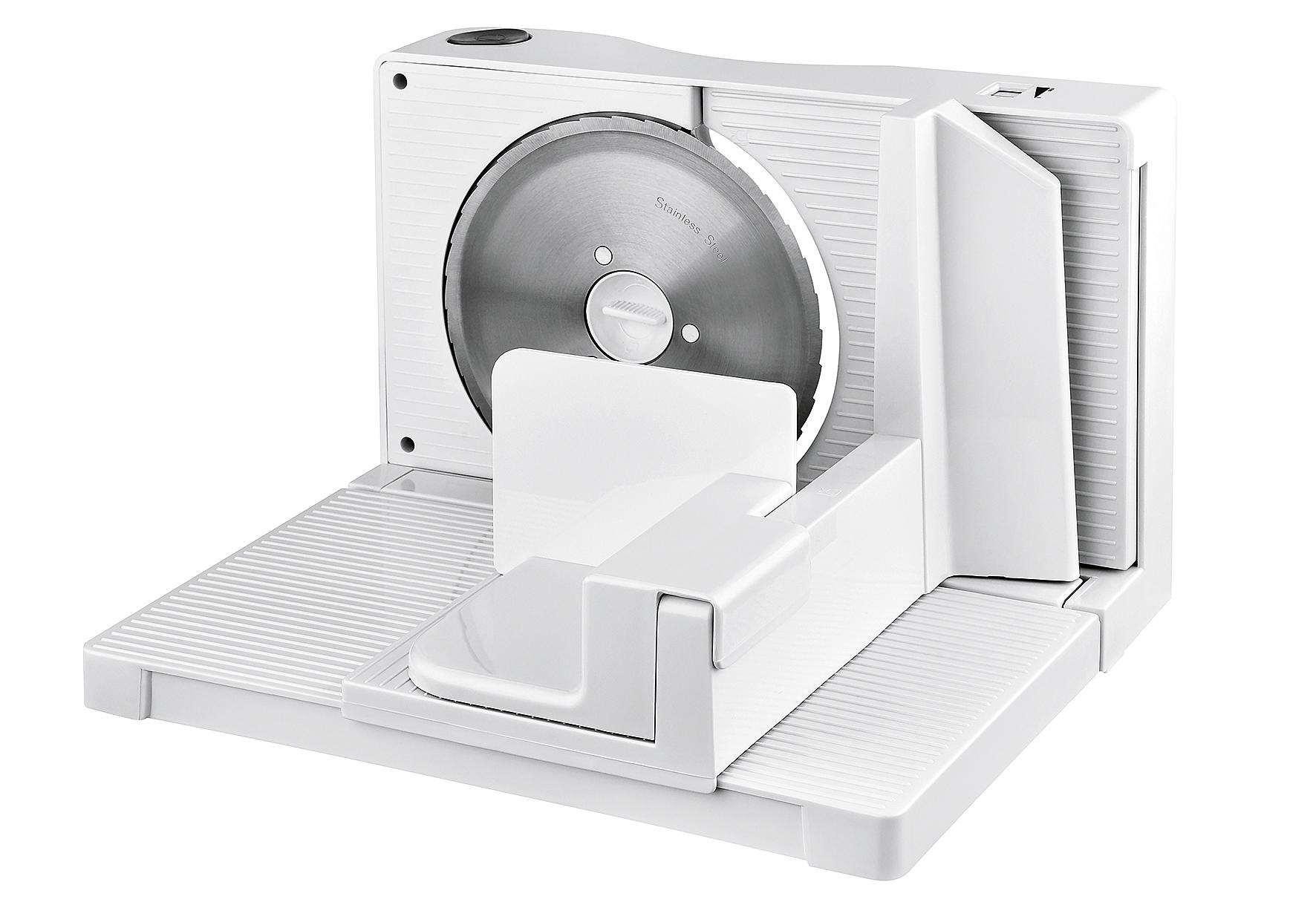 stufenlose Schnittstärkeneinstellung (0-15 mm), abnehmbares Edelstahlmesser mit 17 cm Durchmesser, Ein- / Aus-Sicherheitsschalter für eine sichere Bedienung, breiter, klappbarer Auflagetisch für einen sicheren Gebrauch und eine platzsparende Verstauung, abnehmbarer Auflagetisch für eine leichte Reinigung, rutschfeste Füße für einen sicheren Stand, inkl. Restehalter/Schnittschutz, kraftvoller Motor mit 100 Watt maxAttribute