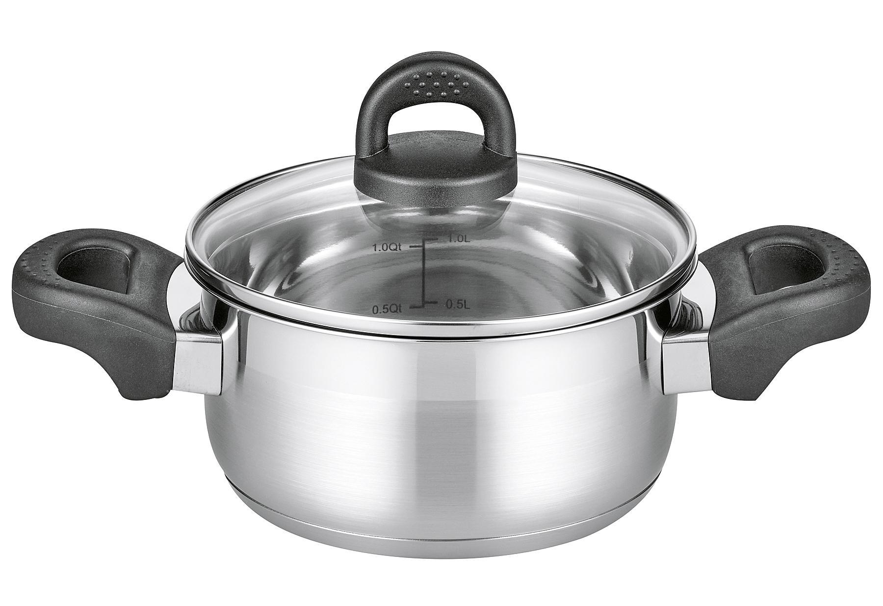 Bratentopf aus Edelstahl 18/8 - Ø 16 cm, Kapsel-Sandwich-Boden mit Aluminium-Kern, zylindrische Form mit Abgießrand, innen hochglanzpoliert, mit integrierter Volumenskala, mit integriertem Öl-Dosier-System, außen satiniert mit hochglanzpoliertem DeKo-Rand, rutschfeste schwarze Kunststoffgriffe mit Edelstahlflammenschutz, hochgewölbter Glasdeckel mit stoßfestem Edelstahlrand und Kunststoffknopf, mit Fingerschutzplatte, spülmaschinengeeignet, für alle Herdarten geeignet, auch für InduktionAttribute