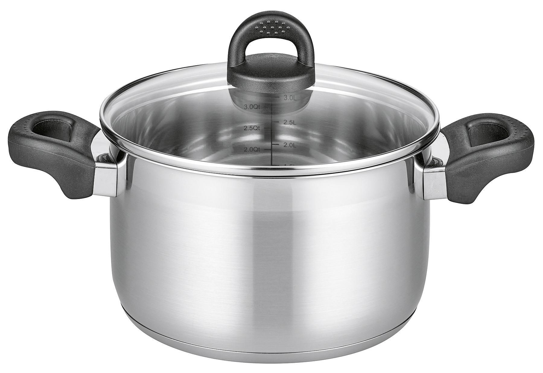Fleischtopf aus Edelstahl 18/8 - Ø 20 cm, Kapsel-Sandwich-Boden mit Aluminium-Kern, zylindrische Form mit Abgießrand, innen hochglanzpoliert, mit integrierter Volumenskala, mit integriertem Öl-Dosier-System, außen satiniert mit hochglanzpoliertem DeKo-Rand, rutschfeste schwarze Kunststoffgriffe mit Edelstahlflammenschutz, hochgewölbter Glasdeckel mit stoßfestem Edelstahlrand und Kunststoffknopf, mit Fingerschutzplatte, spülmaschinengeeignet, für alle Herdarten geeignet, auch für InduktionAttribute