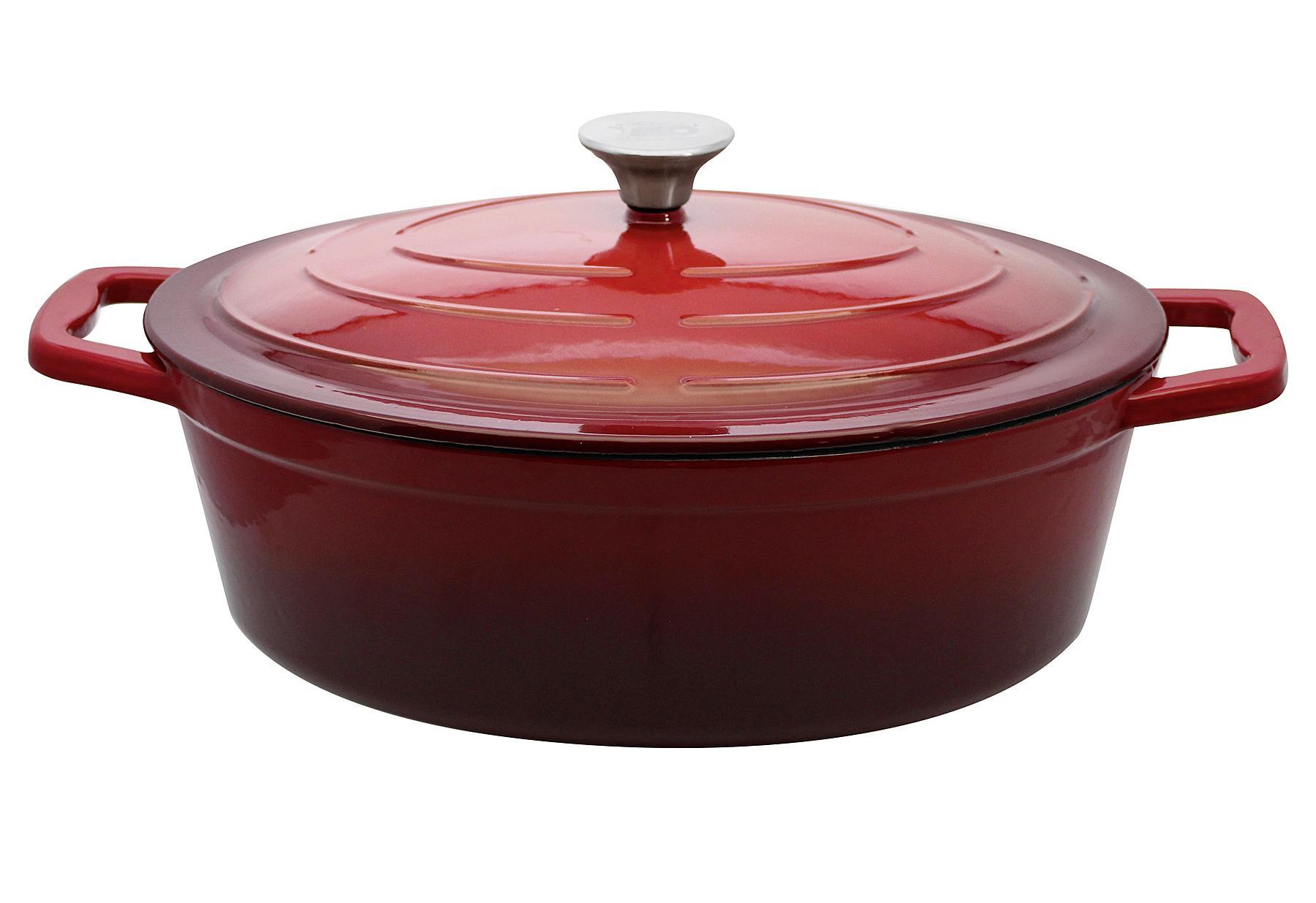Bräter, hochwertiges Gusseisen | Wandstärke ca. 4 mm | Bodenstärke ca. 4,8 mm | innen cremefarben emailliert |außen rot emailliert | Deckel Gusseisen mit Edelstahlknauf | scharfe und krosse Zubereitung | optimale Wärmeleitung | leicht zu reinigen und säurebeständig | spülmaschinengeeignet | backofenfest bis 240°C | für alle Herdarten geeignet, auch für Induktion. Verpackung: Fotokarton- der Umwelt zuliebe ohne Polybeutel. Volumen 5 Liter. Ø 33 cm, H 13 cm.Attribute