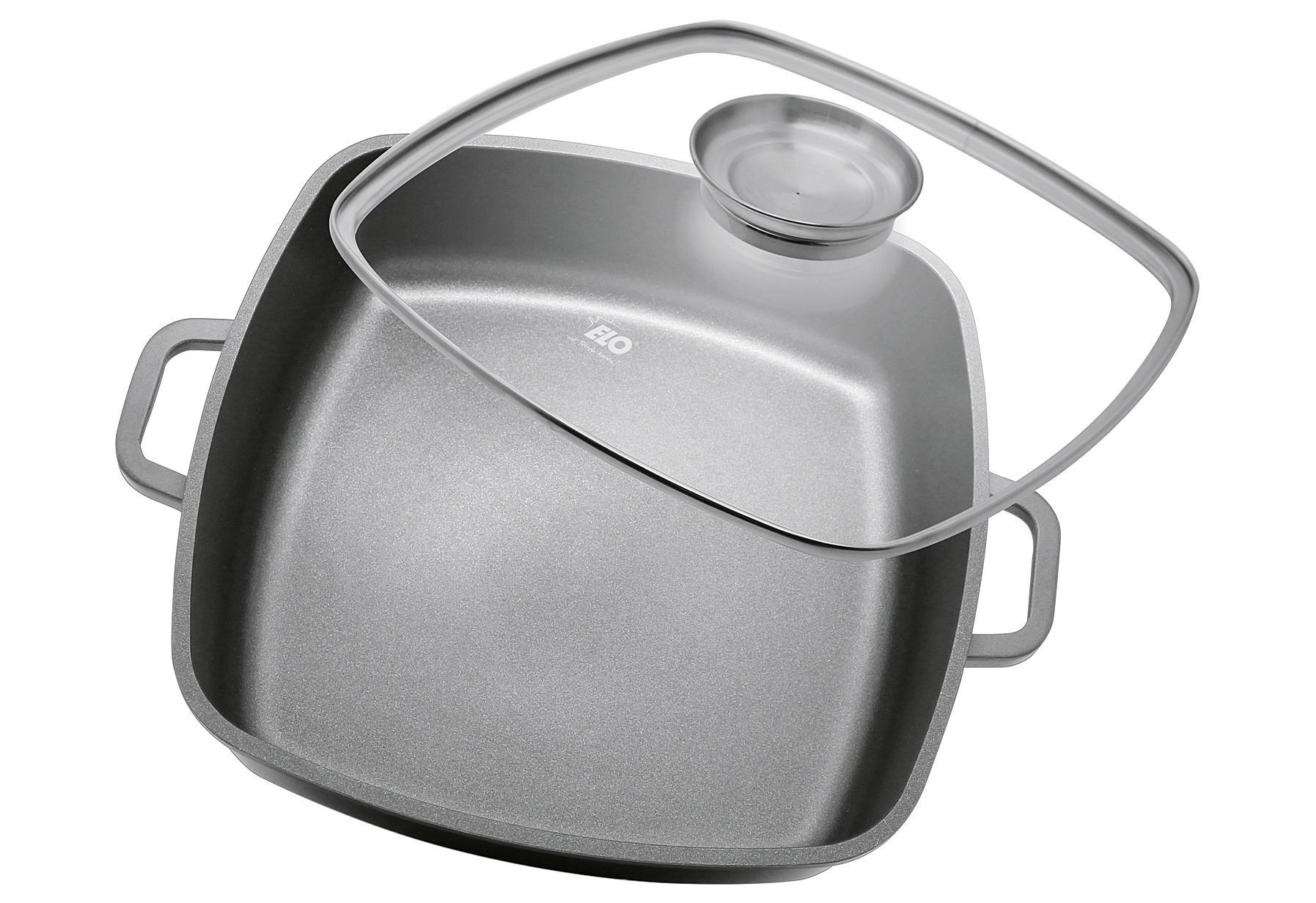 Servierpfanne mit Deckel 28 x 28 cm Alucast ELO DUR Select. Hochwertiger Aluminiumguss, Wandstärke ca. 2,0 mm, Bodenstärke ca. 4,5 mm, gelochter Induktionsboden, innen schwarze hochwertige, kratzfeste ELODUR® Select Antihaftversiegelung, außen schwarz Silikon Polyester beschichtet, eingearbeitete Seitenbeschlagteile aus Aluguss, Glasdeckel mit stoßfestem Edelstahlrand und Aromaknopf, sehr leichte Reinigung, da nichts haften bleibt, gleichmäßige Wärmeverteilung bis zum Rand, spart Zeit und Energie, spülmaschinengeeignet, mit Glasdeckel backofenfest bis 180°C, ohne Glasdeckel bis 240°C. Für alle Herdarten geeignet, auch für Induktion. Verpackung: Nachhaltige Farb-Banderole aus Karton. Maße: (LxB): 28x28 cm, Höhe 7,9 cm, Volumen 3,6 Liter.Lieferumfang: