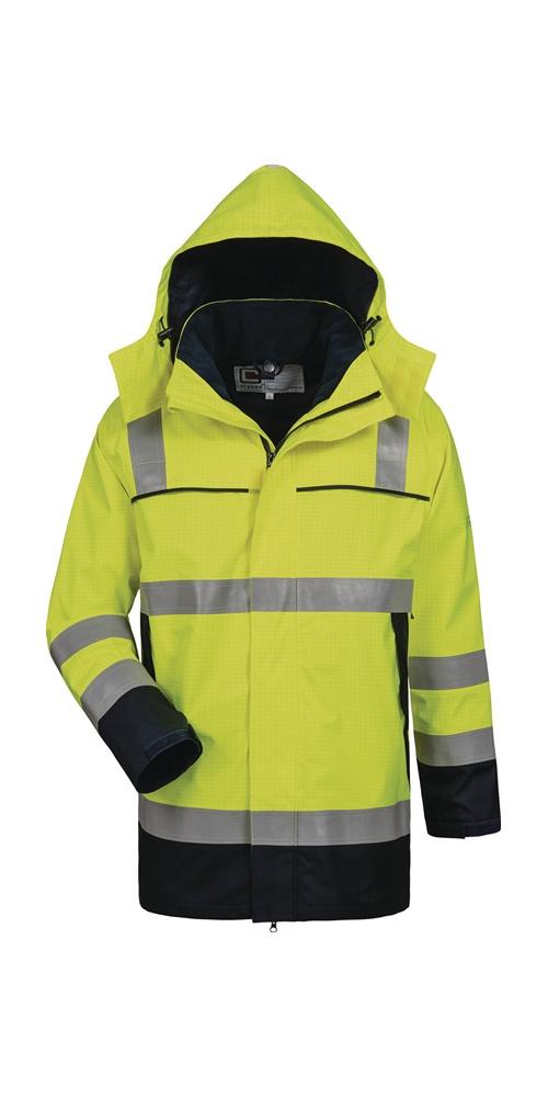 EN ISO 20471 Kl. 3, EN 343 Kl. 3/2/X, EN ISO 11611 Kl. 2 A1+A2, EN ISO 11612: A1+A2 B1 C1 E2 F1, EN 1149-5, EN 13034 Typ 6, IEC 61482-2 APC1 (4kA), EN ISO 13688 · Obermaterial: Außenlage: 98% Polyester / 2% Karbon, Innenlage: 60% Modacryl / 40% Baumwolle · Futter: 100% Baumwolle Atmungsaktivität: 5.000 g/m²/24 h · Wassersäule: 10.000 mm · Futter: 100% Baumwolle · Farbe: fluoreszierend gelb/marine · wind- und wasserdicht, atmungsaktiv · hochwertiger mehrlagiger Oberstoff, robust, abrieb- und reißfest · Nähte geschweißt · LOXY®-Reflexmaterial · verdeckter robuster 2-Wege-Front-Reißverschluss mit Patte und Druckknöpfen · verdeckte Knöpfe garantieren Kratzfreiheit · Ärmelbund mit Klettverschluss weitenverstellbar · Saum weitenverstellbar · verstaubare gefütterte Kapuze verstellbar mit elastischen Kordeln · hoher Kragen mit Schutz gegen Witterung · der Parka ist von außen als Multinorm- Schutzbekleidung erkennbar durch das Multinorm-Emblem auf dem linken Oberarm · Taschen: 1 Napoleontasche mit Reißverschluss · 2 Brusttaschen mit Druckknöpfen · 2 Hüfttaschen mit Klettverschlüssen · 2 Innentaschen mit Klettverschlüssenauf Anfrage lieferbare Größen: S-3XL