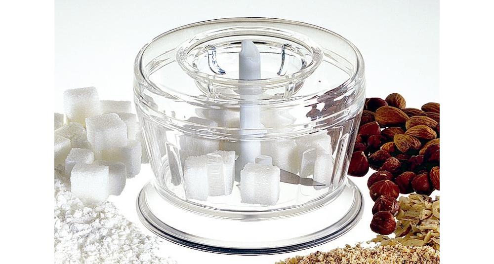 kompakter Zerkleinerer als Ergänzung für alle Zauberstab-Modelle, unentbehrlich in der Küche zum: Zerkleinern und Mahlen von Nüssen, Gewürzen, Schokolade, Kaffee, Würfelzucker zu Puderzucker usw., transparenter Behälter, 2-flügeliges Messer aus Edelstahl, standsicher durch Fußring, einfache Reinigung: alle Teile spülmaschinengeeignetAttribute