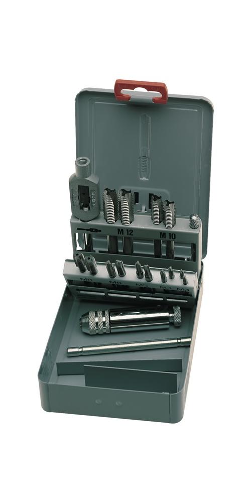 HSS · DIN 352 · Industriequalität · bestehend aus:je 2 Gewindebohrer HSS, M3, M4, M5, M6, M8, M10 und M12 · 1 Windeisen · 1 Werkzeughalter