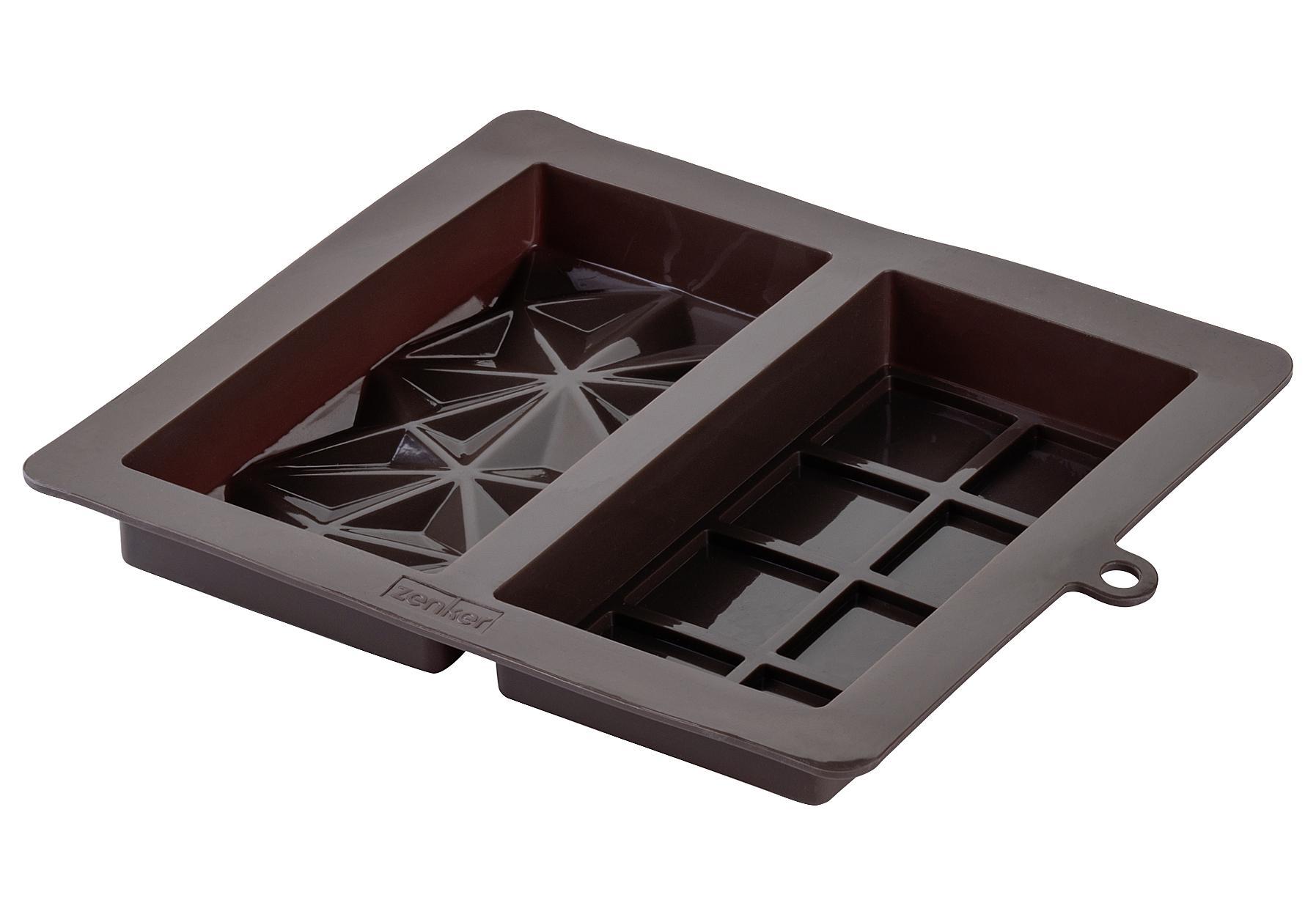 ZENKER Silikonform doppelt Dubai-Schokolade, Silikon, Maße: (LxBxH): 19x22,5x2,8 cm, absolutes Trendprodukt, mit dem das Selbermachen von Dubai-Schokolade im Handumdrehen gelingt, extra tiefe Schokoladenform für die Befüllung mit Pistazien & Co., zwei verschiedene Tafel-Designs mit Gitter- & Rautenmuster, geschmacksneutral, fruchtsäurebeständig, temperaturbeständig von -40°C bis +230°C, spülmaschinengeeignet, braun.x