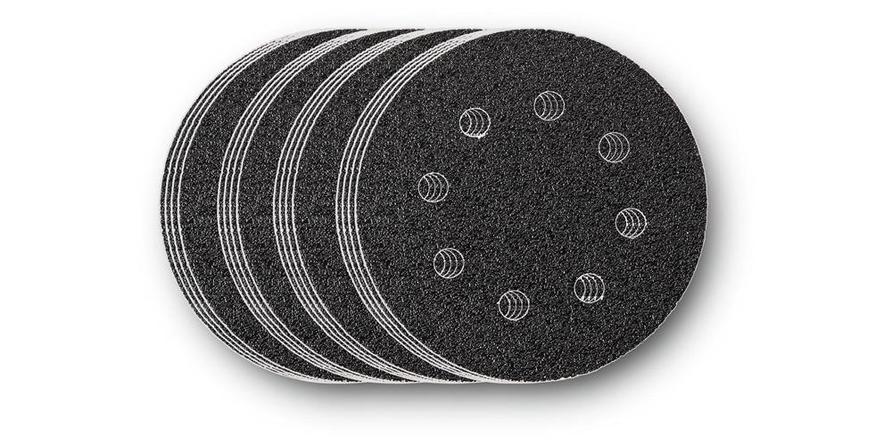 rund · gelocht · für den universellen Einsatz von Grob- bis Feinschliff auf nahezu allen Materialien · Korund-Schleifkörner und Vollkunstharzbindung garantieren hohe Abtragsleistung, geringes Zusetzen und hohe Standzeit · Einsatz mit und ohne Absaugung · KletthaftungLieferumfang: je 4 Schleifblätter K. 60, 80, 120, 180